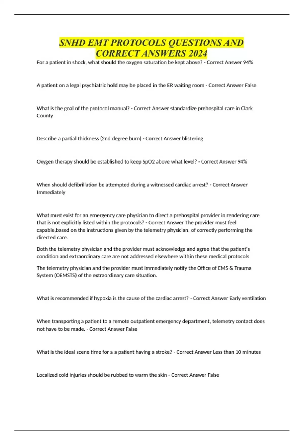 SNHD EMT PROTOCOLS QUESTIONS AND CORRECT ANSWERS 2024 For a patient in shock, what should the oxygen saturation be kept above? - Correct Answer 94% A patient on a legal psychiatric hold may be placed in the ER waiting room - Correct Answer False What is the goal of the protocol manual? - Correct Answer standardize prehospital care in Clark County Describe a partial thickness (2nd degree burn) - Correct Answer blistering Oxygen therapy should be established to keep SpO2 above what level? - Correct Answer 94% When should defibrillation be attempted during a witnessed cardiac arrest? - Correct Answer Immediately What must exist for an emergency care physician to direct a prehospital provider in rendering care that is not explicitly listed within the protocols? - Correct Answer The provider must feel capable,based on the instructions given by the telemetry physician, of correctly performing the directed care. Both the telemetry physician and the provider must acknowledge and agree that the patient's condition and extraordinary care are not addressed elsewhere within these medical protocols The telemetry physician and the provider must immediately notify the Office of EMS & Trauma System (OEMSTS) of the extraordinary care situation. What is recommended if hypoxia is the cause of the cardiac arrest? - Correct Answer Early ventilation When transporting a patient to a remote outpatient emergency department, telemetry contact does not have to be made. - Correct Answer False What is the ideal scene time for a a patient having a stroke? - Correct Answer Less than 10 minutes Localized cold injuries should be rubbed to warm the skin - Correct Answer False For a patient to be transported to an approved alcohol and drug abuse facility, the pulse rate must be between what range? - Correct Answer 60-120 Which of the following should be performed for a patient with hyperthermia? - Correct Answer Remove from environment Temperature measurement