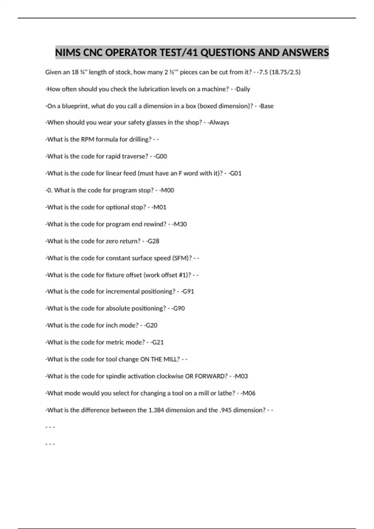 NIMS CNC OPERATOR TEST/41 QUESTIONS AND ANSWERS
