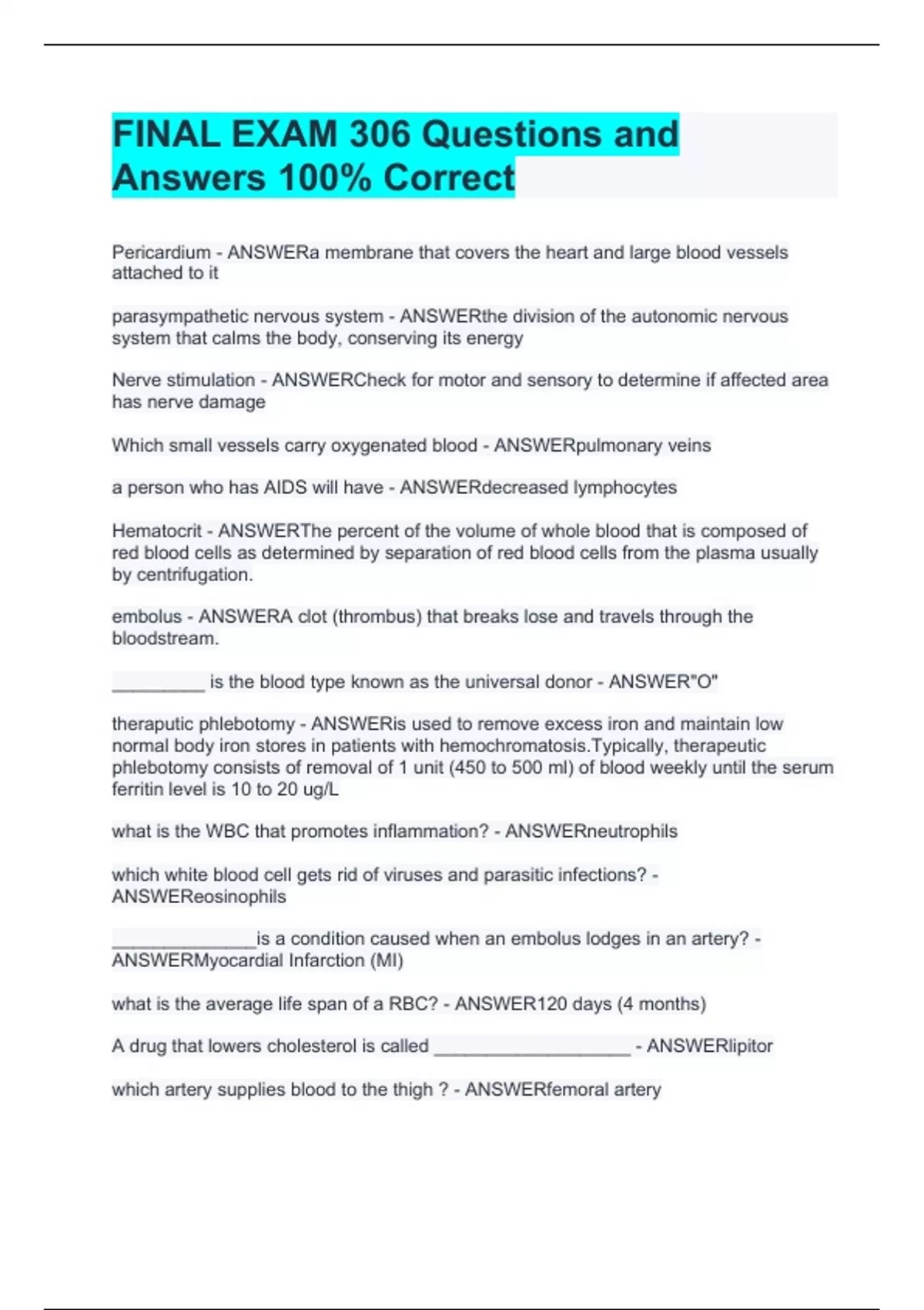 FINAL EXAM 306 Questions and Answers 100% CorrectFINAL EXAM 306 Questions and Answers 100% CorrectFINAL EXAM 306 Questions and Answers 100% CorrectFINAL EXAM 306 Questions and Answers 100% CorrectPericardium - ANSWERa membrane that covers the heart and large blood vessels attached to it parasympathetic nervous system - ANSWERthe division of the autonomic nervous system that calms the body, conserving its energy