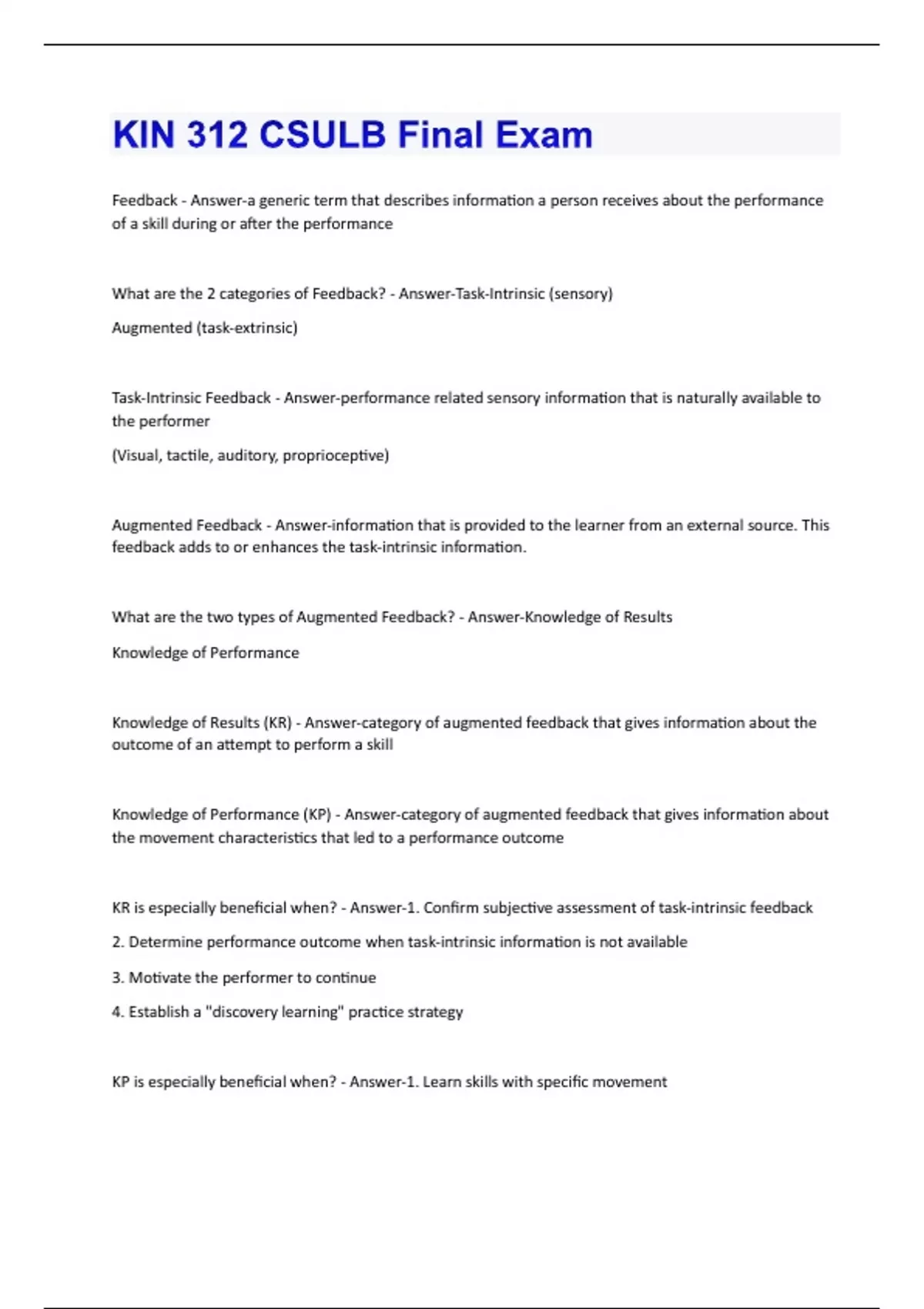 Feedback - Answer-a generic term that describes information a person receives about the performance of a skill during or after the performance What are the 2 categories of Feedback? - Answer-Task-Intrinsic (sensory) Augmented (task-extrinsic) Task-Intrinsic Feedback - Answer-performance related sensory information that is naturally available to the performer (Visual, tactile, auditory, proprioceptive) Augmented Feedback - Answer-information that is provided to the learner from an external source. This feedback adds to or enhances the task-intrinsic information. What are the two types of Augmented Feedback? - Answer-Knowledge of Results Knowledge of Performance Knowledge of Results (KR) - Answer-category of augmented feedback that gives information about the outcome of an attempt to perform a skill Knowledge of Performance (KP) - Answer-category of augmented feedback that gives information about the movement characteristics that led to a performance outcome KR is especially beneficial when? - Answer-1. Confirm subjective assessment of task-intrinsic feedback 2. Determine performance outcome when task-intrinsic information is not available 3. Motivate the performer to continue 4. Establish a "discovery learning" practice strategy KP is especially beneficial when? - Answer-1. Learn skills with specific movement2. Improve specific movements or correct specific movement errors 3. Learn to activate specific muscles 4. Facilitate learning when KR is redundant with task-intrinsic feedback What are the types of Knowledge of Performance? - Answer-Descriptive (describes error) and Prescriptive (describes error and prescribes how to correct it) Which KP is better to facilitate skill learning? - Answer-It depends which stage of learning the performer is in. Initial Stage - Prescriptive Later Stages - Descriptive Concurrent Augmented Feedback - Answer-augmented feedback that is provided while a person is performing a skill or making a movement Terminal Augmented Feedback - Answer-augmented feedback that is provided after a person has completed the performance of a skill or a movement What is the traditional view of presenting augmented feedback? - Answer-100% frequency is best for learning (aug. feedback for every trial) What is the current view of presenting augmented feedback? - Answer-Less than 100% frequency is best for learning Why Is Less Than 100% Frequency of Augmented Feedback Better for Learning - Answer-1. Increases Problem Solving Activity 2. Guidance Hypothesis Guidance Hypothesis - Answer-Hypothesis indicating that the role of augmented feedback in learning is to guide performance to be correct during practice; however if provided too frequently, it can cause thelearner to develop a dependency "crutch" on its availability and therefore to perform poorly when it is not available. 4 Techniques that Reduce Augmented Feedback Frequency - Answer-1. Fading 2. Performance Bandwidth Technique 3. Learner Requested Feedback 4. Summary Technique