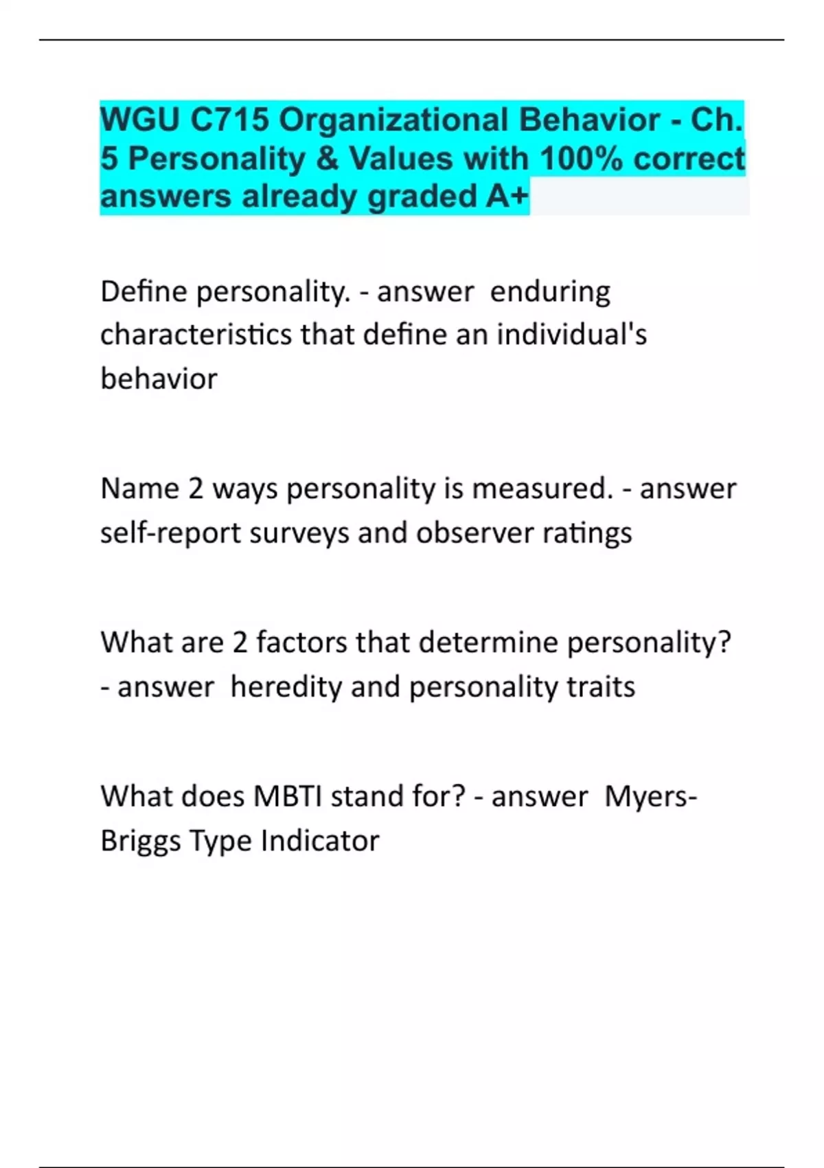 WGU C715 Organizational Behavior - Ch. 5 Personality & Values with 100% correct answers already graded A+