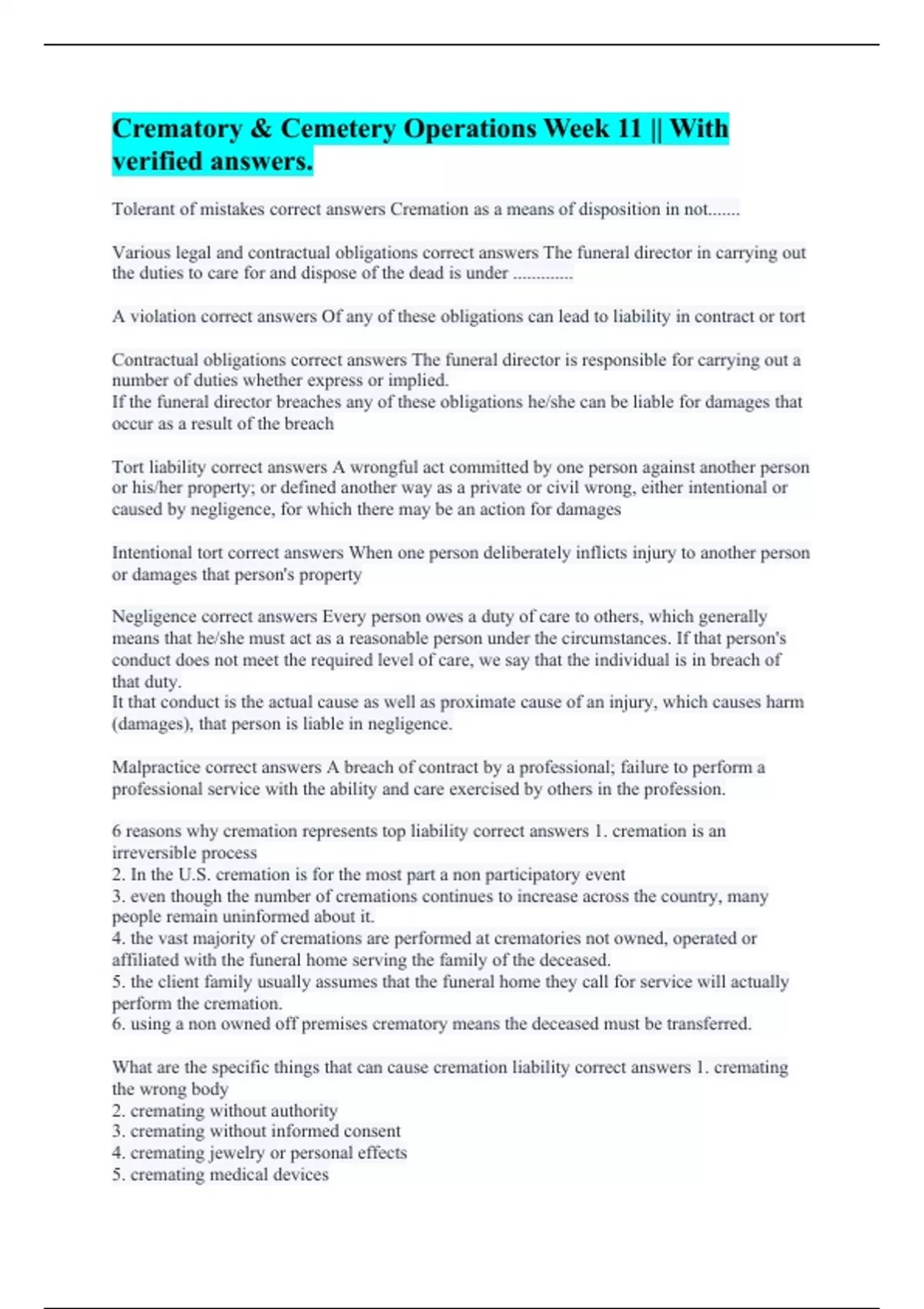 Tolerant of mistakes correct answers Cremation as a means of disposition in not....... Various legal and contractual obligations correct answers The funeral director in carrying out the duties to care for and dispose of the dead is under ............. A violation correct answers Of any of these obligations can lead to liability in contract or tort Contractual obligations correct answers The funeral director is responsible for carrying out a number of duties whether express or implied. If the funeral director breaches any of these obligations he/she can be liable for damages that occur as a result of the breach Tort liability correct answers A wrongful act committed by one person against another person or his/her property; or defined another way as a private or civil wrong, either intentional or caused by negligence, for which there may be an action for damages Intentional tort correct answers When one person deliberately inflicts injury to another person or damages that person's property Negligence correct answers Every person owes a duty of care to others, which generally means that he/she must act as a reasonable person under the circumstances. If that person's conduct does not meet the required level of care, we say that the individual is in breach of that duty. It that conduct is the actual cause as well as proximate cause of an injury, which causes harm (damages), that person is liable in negligence. Malpractice correct answers A breach of contract by a professional; failure to perform a professional service with the ability and care exercised by others in the profession. 6 reasons why cremation represents top liability correct answers 1. cremation is an irreversible process 2. In the U.S. cremation is for the most part a non participatory event 3. even though the number of cremations continues to increase across the country, many people remain uninformed about it. 4. the vast majority of cremations are performed at crematories not owned, operated or affiliated with the funeral home serving the family of the deceased. 5. the client family usually assumes that the funeral home they call for service will actually perform the cremation. 6. using a non owned off premises crematory means the deceased must be transferred. What are the specific things that can cause cremation liability correct answers 1. cremating the wrong body 2. cremating without authority 3. cremating without informed consent 4. cremating jewelry or personal effects 5. cremating medical devices