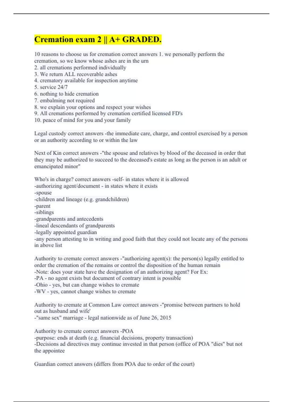 10 reasons to choose us for cremation correct answers 1. we personally perform the cremation, so we know whose ashes are in the urn 2. all cremations performed individually 3. We return ALL recoverable ashes 4. crematory available for inspection anytime 5. service 24/7 6. nothing to hide cremation 7. embalming not required 8. we explain your options and respect your wishes 9. All cremations performed by cremation certified licensed FD's 10. peace of mind for you and your family Legal custody correct answers -the immediate care, charge, and control exercised by a person or an authority according to or within the law Next of Kin correct answers -"the spouse and relatives by blood of the deceased in order that they may be authorized to succeed to the deceased's estate as long as the person is an adult or emancipated minor" Who's in charge? correct answers -self- in states where it is allowed -authorizing agent/document - in states where it exists -spouse -children and lineage (e.g. grandchildren) -parent -siblings -grandparents and antecedents -lineal descendants of grandparents -legally appointed guardian -any person attesting to in writing and good faith that they could not locate any of the persons in above list Authority to cremate correct answers -"authorizing agent(s): the person(s) legally entitled to order the cremation of the remains or control the disposition of the human remain -Note: does your state have the designation of an authorizing agent? For Ex: -PA - no agent exists but document of contrary intent is possible -Ohio - yes, but can change wishes to cremate -WV - yes, cannot change wishes to cremate Authority to cremate at Common Law correct answers -"promise between partners to hold out as husband and wife' -"same sex" marriage - legal nationwide as of June 26, 2015 Authority to cremate correct answers -POA -purpose: ends at death (e.g. financial decisions, property transaction) -Decisions ad directives may continue invested in that person (office of POA "dies" but not the appointee Guardian correct answers (differs from POA due to order of the court)