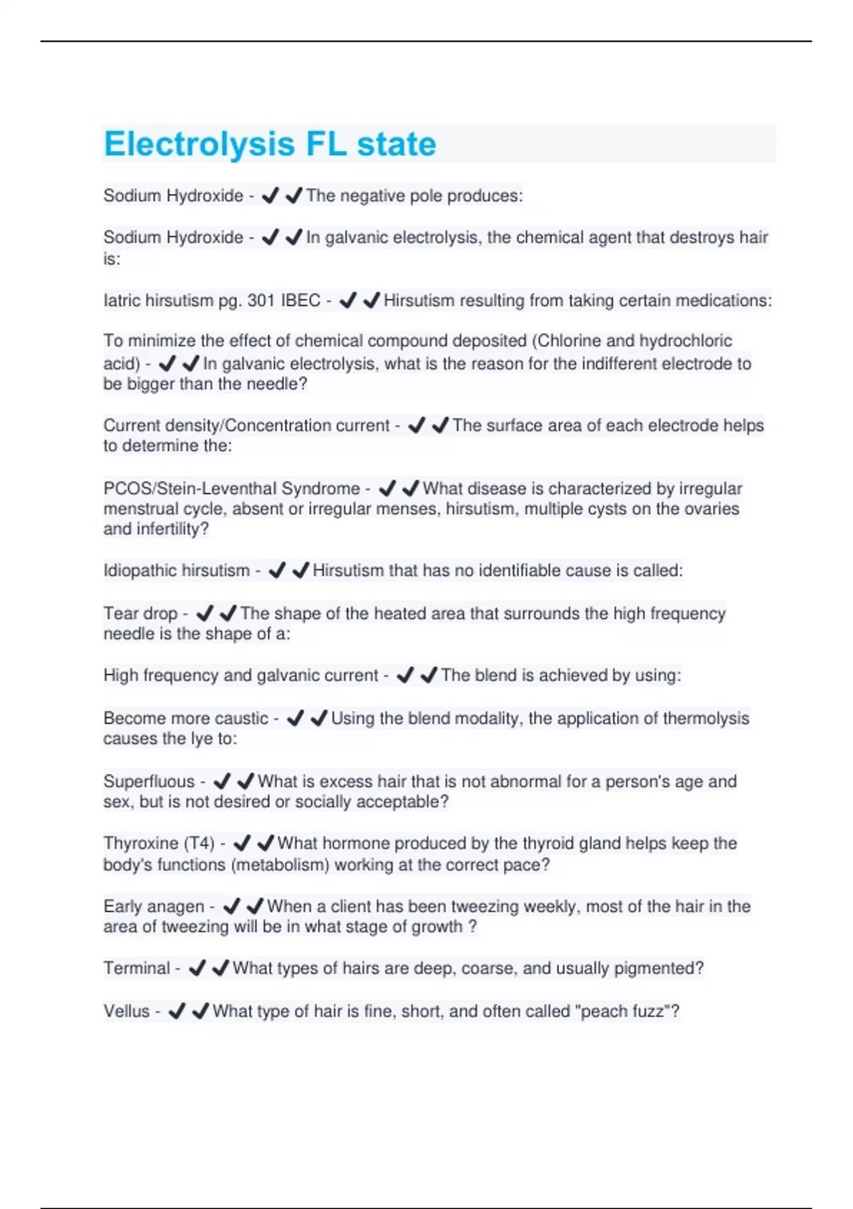 Sodium Hydroxide - ️️The negative pole produces: Sodium Hydroxide - ️️In galvanic electrolysis, the chemical agent that destroys hair is: Iatric hirsutism pg. 301 IBEC - ️️Hirsutism resulting from taking certain medications: To minimize the effect of chemical compound deposited (Chlorine and hydrochloric acid) - ️️In galvanic electrolysis, what is the reason for the indifferent electrode to be bigger than the needle? Current density/Concentration current - ️️The surface area of each electrode helps to determine the: PCOS/Stein-LeventhaI Syndrome - ️️What disease is characterized by irregular menstrual cycle, absent or irregular menses, hirsutism, multiple cysts on the ovaries and infertility? Idiopathic hirsutism - ️️Hirsutism that has no identifiable cause is called: Tear drop - ️️The shape of the heated area that surrounds the high frequency needle is the shape of a: High frequency and galvanic current - ️️The blend is achieved by using: Become more caustic - ️️Using the blend modality, the application of thermolysis causes the lye to: Superfluous - ️️What is excess hair that is not abnormal for a person's age and sex, but is not desired or socially acceptable? Thyroxine (T4) - ️️What hormone produced by the thyroid gland helps keep the body's functions (metabolism) working at the correct pace? Early anagen - ️️When a client has been tweezing weekly, most of the hair in the area of tweezing will be in what stage of growth ? Terminal - ️️What types of hairs are deep, coarse, and usually pigmented? Vellus - ️️What type of hair is fine, short, and often called "peach fuzz"?Ferriman-Gallaway Score - ️️What is the method of grading or evaluating hirsutism in women? Accelerated vellus hair - ️️If a vellus hair is stimulated to grow deeper and coarser, it is said to be a(n): Catagen - ️️In what stage of hair growth does the club hair begin forming? Dermis - ️️In which of the following layers of the skin are mast cells found? LH - ️️Which one of the following hormones will cause hirsutism? Delayed healing time - ️️When treating a client with diabetes, what is of the greatest concern? Adrenal - ️️Which gland is most associated with hair growth? Edema - ️️The buildup of interstitial fluid between cells in the skin is: Polycystic Ovaries - ️️Which of the following is the most common cause of hirsutism and menstrual irregularity in women less than 50 years of age? All of the above (Carotene, Blood vessels, Melanin) - ️️What contributes to the color of the skin? Epidermis: Stratum Lucidum - ️️In which layer of the skin is Eleidin found? Spinosum - ️️What is the prickle cell layer of the skin? Dermis - ️️What is also known as "true skin" or "cutis"? Dark Skin - ️️In what type of skin are melanocytes larger and more active? Papillary Layer - ️️What is made up of elastic, collagenous, and reticular fibers? Skin, hair, eyes - ️️Where do you find melanin? Meissner - ️️What type of corpuscle is found in the papillary layer that is sensitive to touch? Merkel - ️️Which corpuscle in the skin is sensitive to light touch and is the only corpuscle in the epidermis?Ruffini - ️️Which corpuscle in the skin is sensitive to heat? Reticular - ️️Which layer of the skin is composed of dense bundles of collagen fibers? Krause - ️️Which corpuscle in the skin is sensitive to cold? Pacinian - ️️Which corpuscle in the skin is sensitive to pressure? Subcutaneous and Subcutis - ️️Which layer is at the base of the dermis and is composed of fatty or adipose tissue? Inner root sheath (IRS) - ️️What serves as an anchor and holds the hair in the follicle? Apocrine - ️️What type of glands are located in the genital axillae areas and are usually the smelly ones"? Underarm and Pubic Area - ️️In what area of the body do the apocrine glands tend to be the largest? Sebaceous gland - ️️In which gland does vellus hair originate? Sebum - ️️What is produced by the sebaceous gland that helps lubricate the skin? Early anagen - ️️In which state of hair growth is easiest for an electrologist to epilate? Arrector pili - ️️What is an appendage to the hair follicle that is attached midway between the bulb and the sebaceous gland?