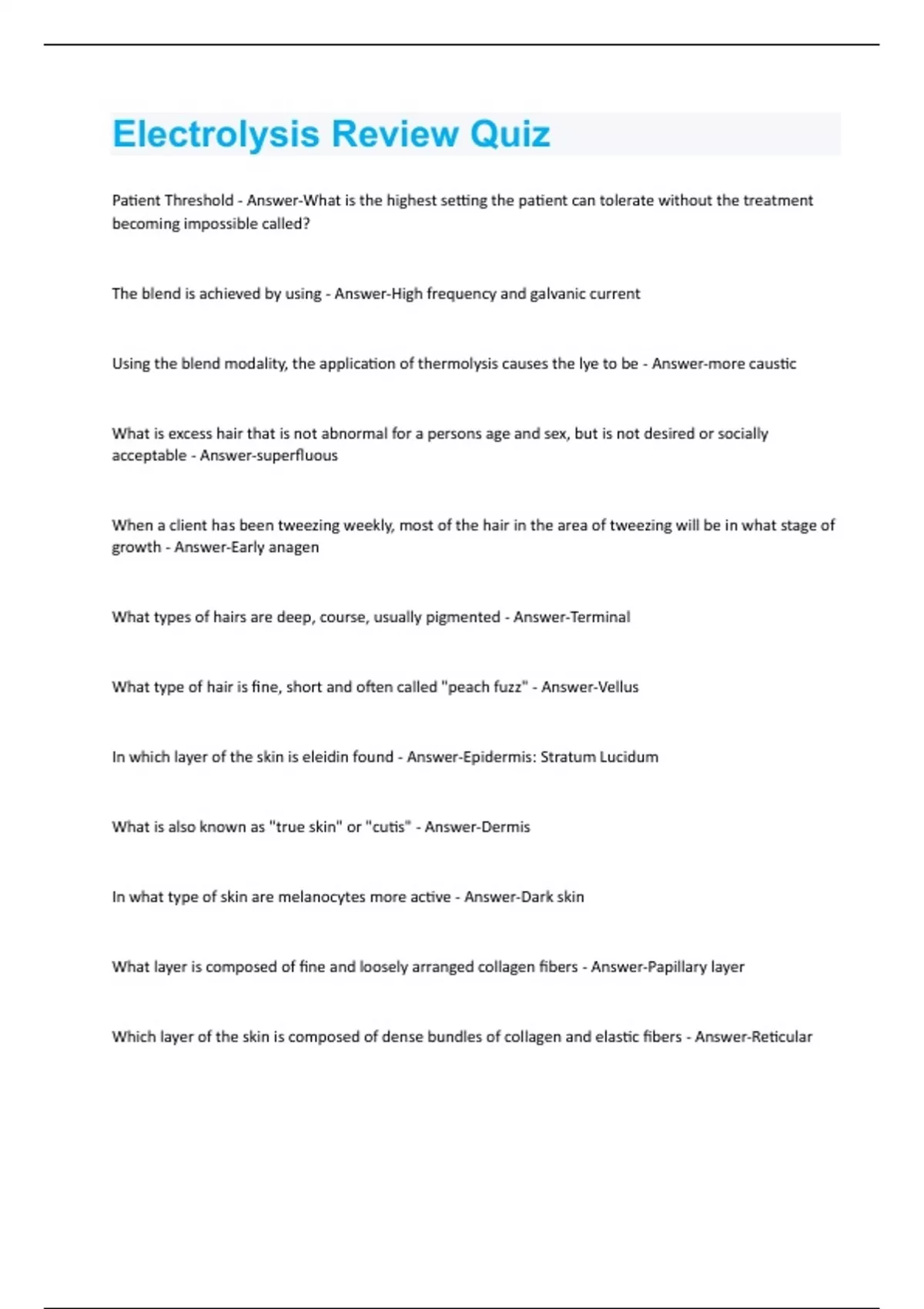 Patient Threshold - Answer-What is the highest setting the patient can tolerate without the treatment becoming impossible called? The blend is achieved by using - Answer-High frequency and galvanic current Using the blend modality, the application of thermolysis causes the lye to be - Answer-more caustic What is excess hair that is not abnormal for a persons age and sex, but is not desired or socially acceptable - Answer-superfluous When a client has been tweezing weekly, most of the hair in the area of tweezing will be in what stage of growth - Answer-Early anagen What types of hairs are deep, course, usually pigmented - Answer-Terminal What type of hair is fine, short and often called "peach fuzz" - Answer-Vellus In which layer of the skin is eleidin found - Answer-Epidermis: Stratum Lucidum What is also known as "true skin" or "cutis" - Answer-Dermis In what type of skin are melanocytes more active - Answer-Dark skin What layer is composed of fine and loosely arranged collagen fibers - Answer-Papillary layer Which layer of the skin is composed of dense bundles of collagen and elastic fibers - Answer-ReticularWhich layer is at the base of the dermis and is composed of fatty adipose tissue - Answer-Subcutaneous and subcutis What serves as an anchor and holds the hair in the follicle - Answer-inner root sheath (IRS) What type of gland is located in the genital and axillae areas and usually the "smelly ones" - AnswerApocrine glands In what area of the body do the apocrine glands tend to be the largest - Answer-Under arm In which gland does the vellus hair originate - Answer-Sebaceous gland What is produced by the sebaceous gland that helps lubricate and protect the skin - Answer-Sebum (lipids) In which state of hair growth is hair easiest for electrologist to epilate - Answer-Late anagen What is an appendage to the hair follicle that is attached midway between the bulb in the sebaceous gland (gives goosebumps or makes hair stand up) - Answer-Arrector pili What is also known as baby fetal hair that falls off a few weeks after birth - Answer-Lanugo Which layer of the hair has cells that contain melanin - Answer-Cortex Name the layers of the hair from the inside out - Answer-Medulla, cortex, cuticle Which of the following can cause increased hair growth - Answer-Sun, stress, tweezing and aspirin Which of the following is not part of the pilosebaceous unit - Answer-Sudoriferous glandThe hair and follicle are part of the - Answer-Epidermis and pilosebaceous unit The flow of electrons along a wire cannot occur unless there is - Answer-Electrical pressure (Voltage) The galvanic modality effects permanent hair removal by - Answer-Chemical decomposition Causes of blanching include which of the following - Answer-Over treatment of the skin and shallow insertion What type of hair is associates with or emanates from round follicles - Answer-Straight What type of hair is associated with or emanates from oval follicles - Answer-Wavy