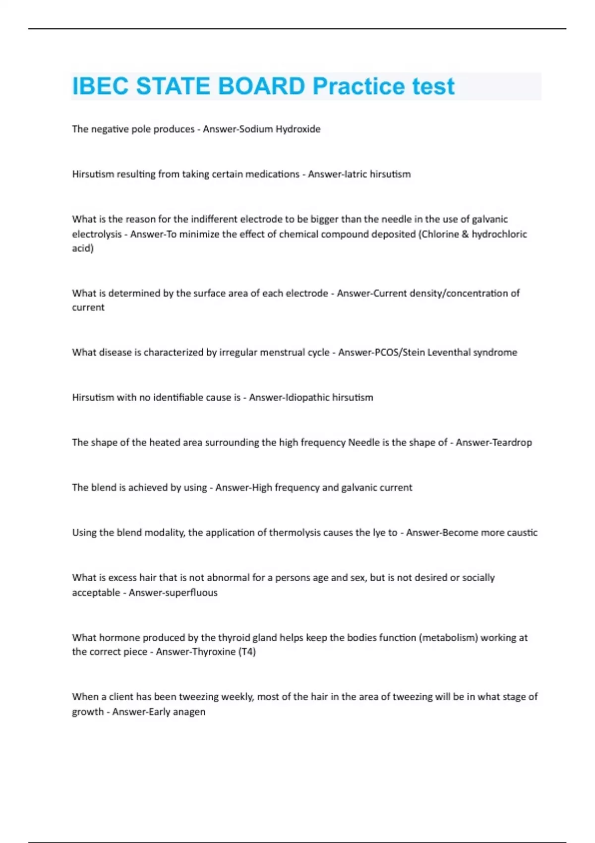 The negative pole produces - Answer-Sodium Hydroxide Hirsutism resulting from taking certain medications - Answer-Iatric hirsutism What is the reason for the indifferent electrode to be bigger than the needle in the use of galvanic electrolysis - Answer-To minimize the effect of chemical compound deposited (Chlorine & hydrochloric acid) What is determined by the surface area of each electrode - Answer-Current density/concentration of current What disease is characterized by irregular menstrual cycle - Answer-PCOS/Stein Leventhal syndrome Hirsutism with no identifiable cause is - Answer-Idiopathic hirsutism The shape of the heated area surrounding the high frequency Needle is the shape of - Answer-Teardrop The blend is achieved by using - Answer-High frequency and galvanic current Using the blend modality, the application of thermolysis causes the lye to - Answer-Become more caustic What is excess hair that is not abnormal for a persons age and sex, but is not desired or socially acceptable - Answer-superfluous What hormone produced by the thyroid gland helps keep the bodies function (metabolism) working at the correct piece - Answer-Thyroxine (T4) When a client has been tweezing weekly, most of the hair in the area of tweezing will be in what stage of growth - Answer-Early anagenWhat types of hairs are deep, course, usually pigmented - Answer-Terminal What type of hair is fine, short and often called peach fuzz - Answer-Vellus What is the method of grading or evaluating hirsutism in women - Answer-Ferriman Gallway score If a vellus hair is stimulated to grow deeper in courser, it is said to be a - Answer-Accelerated vellus hair In what stage of hair growth does the club hair begin forming - Answer-Catagen In which of the following layers of the skin are mast cells found - Answer-Dermis (not fibrous portion) Which of the following hormones will cause hirsutism - Answer-LH (luteinizing hormone) When treating a client with diabetes what is of the greatest concern - Answer-Delayed healing time Which gland is most associated with hair growth - Answer-Adrenal gland The build up of interstitial fluid between cells in the skin is - Answer-Edema Which of the following is the most common cause hirsutism and menstrual irregularity in women less than 50 years of age - Answer-Polycystic ovaries What contributes to the color of the skin - Answer-Carotene, blood vessels and melanin Where do you find melanin - Answer-Skin, hair, eyes In which layer of the skin is eleidin found - Answer-Epidermis: Stratum LucidumWhat is the prickle cell layer of the skin - Answer-Spinosum What is also known as "true skin" or "cutis" - Answer-Dermis