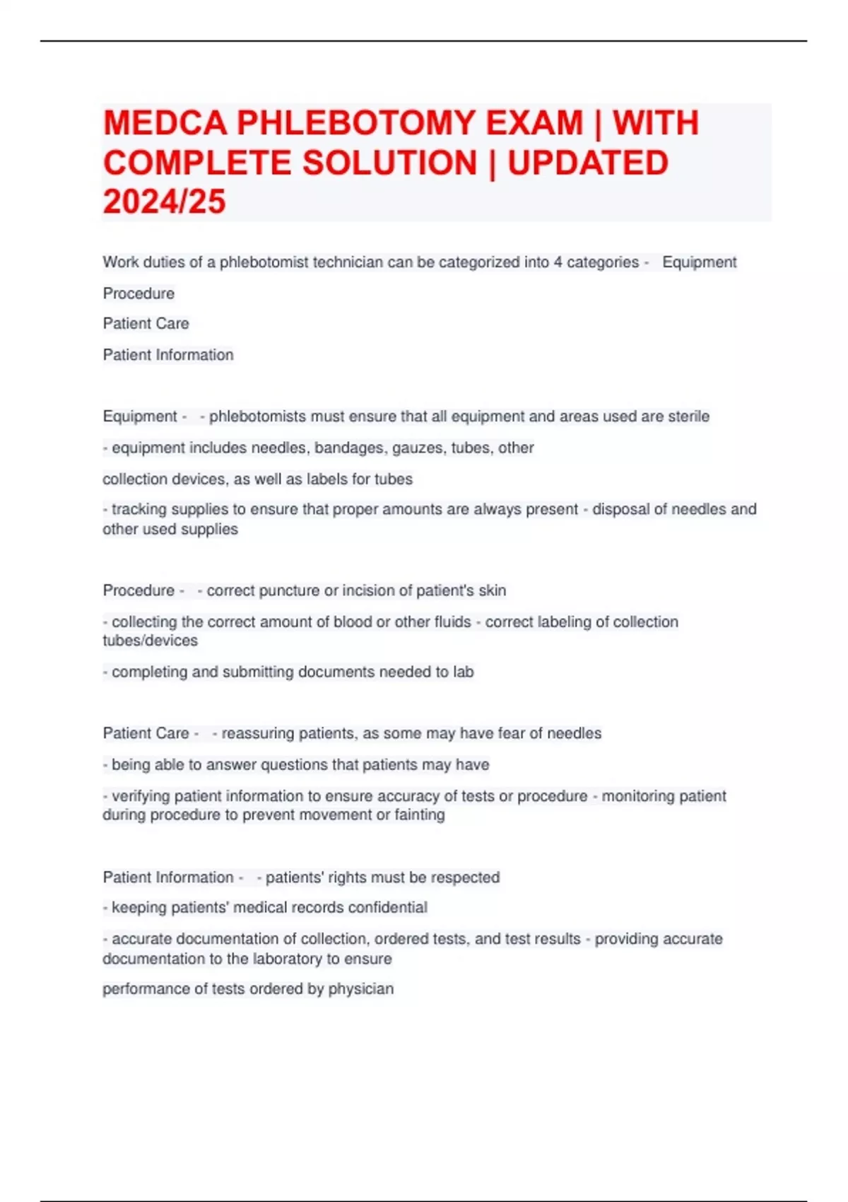 MEDCA PHLEBOTOMY EXAM | WITH COMPLETE SOLUTION | UPDATED 2024/25