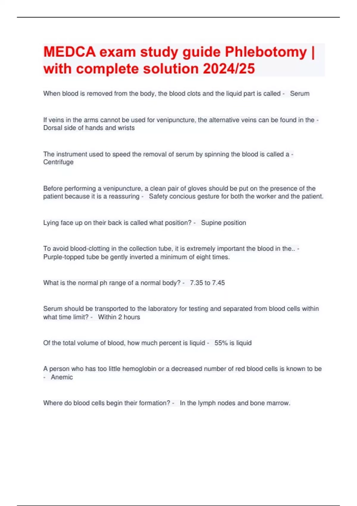 MEDCA exam study guide Phlebotomy | with complete solution 2024/25