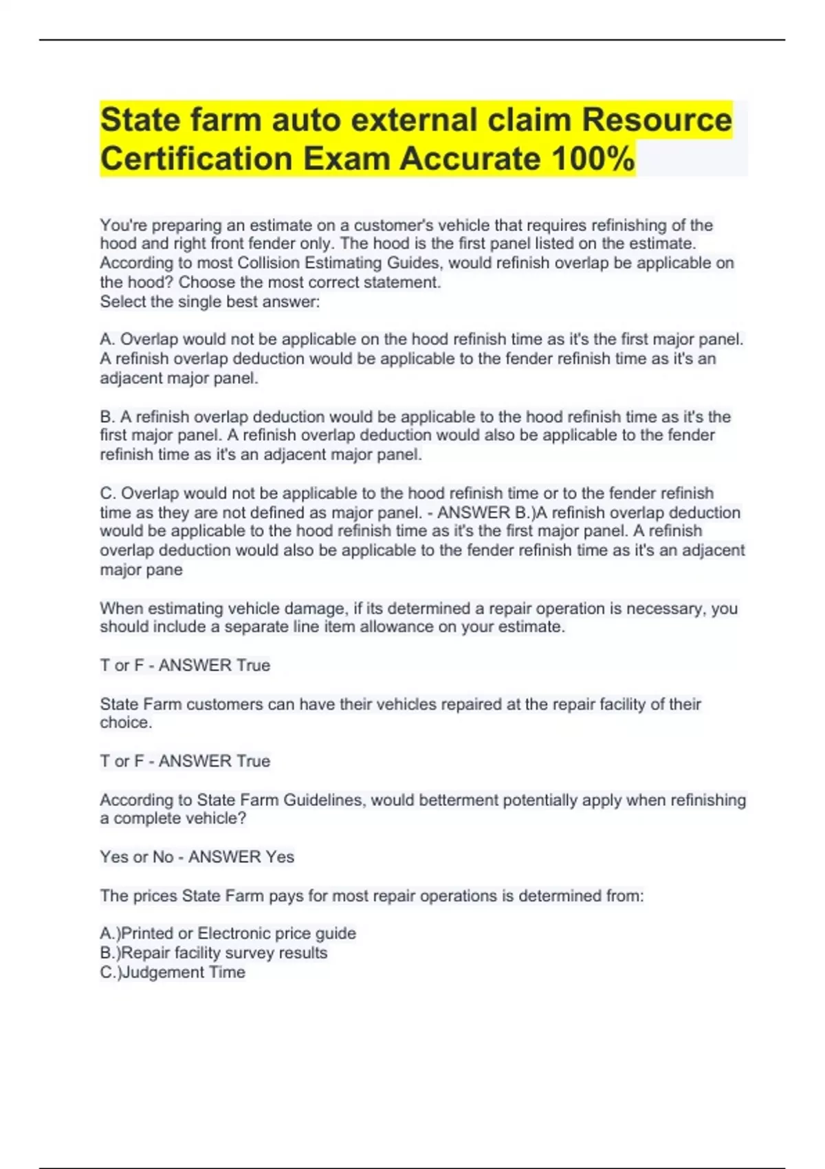 State farm auto external claim Resource Certification Exam Accurate 100%