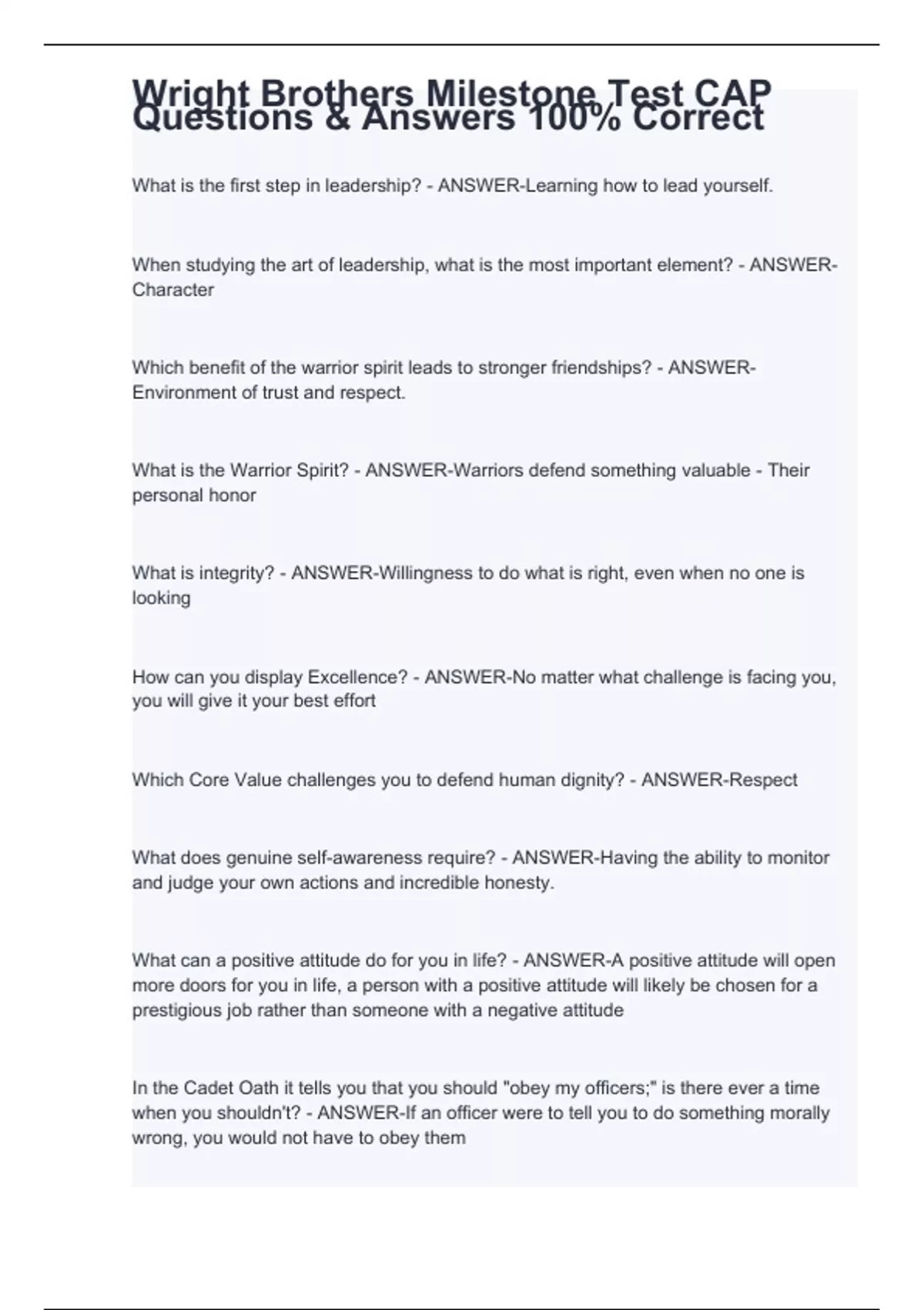 What is the first step in leadership? - ANSWER-Learning how to lead yourself. When studying the art of leadership, what is the most important element? - ANSWER-Character Which benefit of the warrior spirit leads to stronger friendships? - ANSWER-Environment of trust and respect. What is the Warrior Spirit? - ANSWER-Warriors defend something valuable - Their personal honor What is integrity? - ANSWER-Willingness to do what is right, even when no one is looking How can you display Excellence? - ANSWER-No matter what challenge is facing you, you will give it your best effort Which Core Value challenges you to defend human dignity? - ANSWER-Respect What does genuine self-awareness require? - ANSWER-Having the ability to monitor and judge your own actions and incredible honesty. What can a positive attitude do for you in life? - ANSWER-A positive attitude will open more doors for you in life, a person with a positive attitude will likely be chosen for a prestigious job rather than someone with a negative attitude