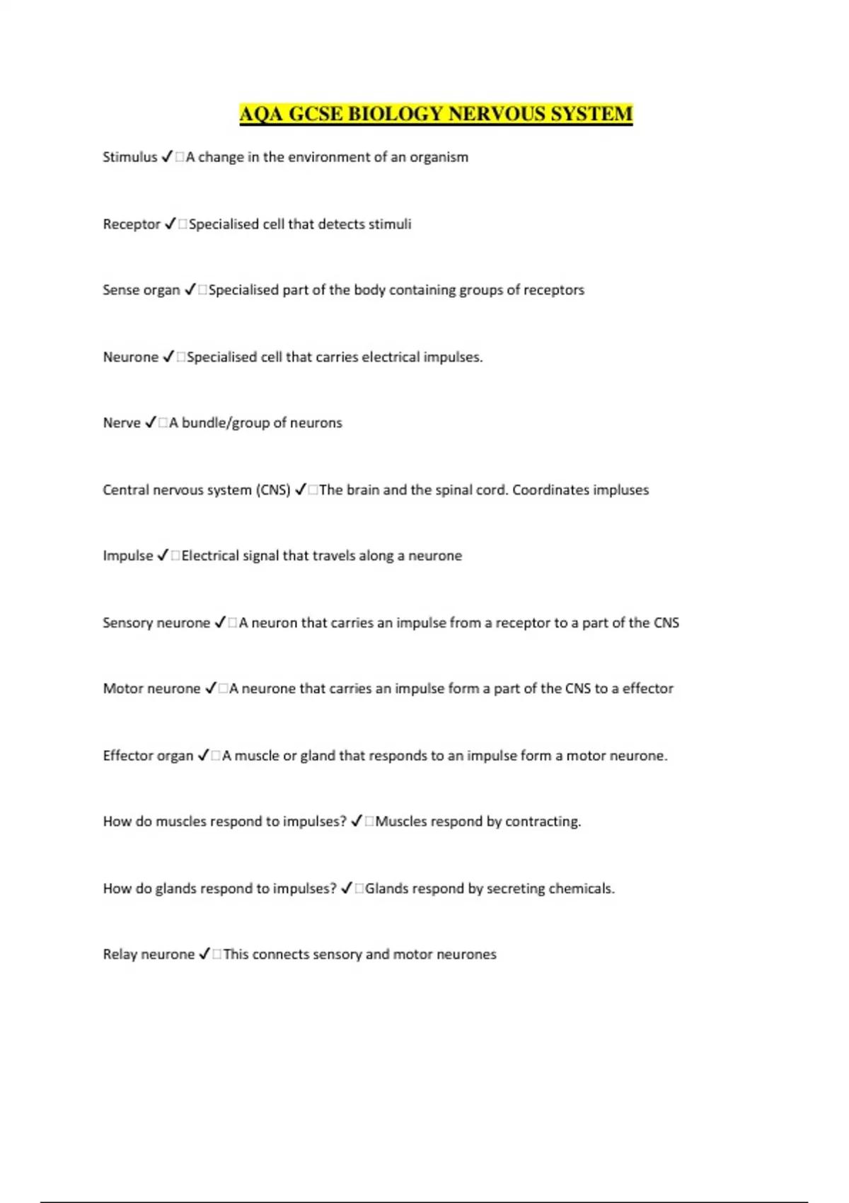 AQA GCSE BIOLOGY NERVOUS SYSTEM Stimulus ️A change in the environment of an organism Receptor ️Specialised cell that detects stimuli Sense organ ️Specialised part of the body containing groups of receptors Neurone ️Specialised cell that carries electrical impulses. Nerve ️A bundle/group of neurons Central nervous system (CNS) ️The brain and the spinal cord. Coordinates impluses Impulse ️Electrical signal that travels along a neurone Sensory neurone ️A neuron that carries an impulse from a receptor to a part of the CNS Motor neurone ️A neurone that carries an impulse form a part of the CNS to a effector Effector organ ️A muscle or gland that responds to an impulse form a motor neurone. How do muscles respond to impulses? ️Muscles respond by contracting. How do glands respond to impulses? ️Glands respond by secreting chemicals. Relay neurone ️This connects sensory and motor neurones Synapse ️This is a very narrow gap between one neurone and the next Reflex action ️This is a rapid automatic response to a stimulus that does not involve conscious thought. Reflex arc ️The pathway for a reflex action Give examples of receptors found in the body including the stimuli they detect ️Receptors in the eyes, sensitive to light. Receptors in the ears, sensitive to sound and changes in position. Receptors in the tongue, sensitive to chemicals which enable us to taste and smell. Receptors in skin, sensitive to touch, pain, pressure and temperature change