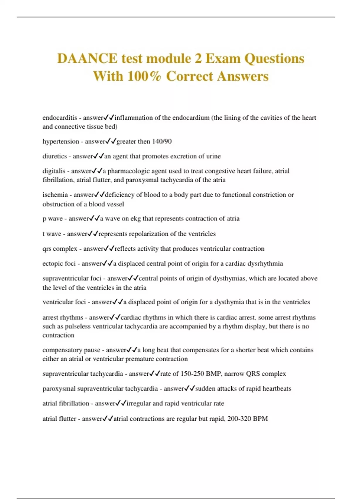 DAANCE test module 2 Exam Questions With 100% Correct Answers endocarditis - answerinflammation of the endocardium (the lining of the cavities of the heart and connective tissue bed) hypertension - answergreater then 140/90 diuretics - answeran agent that promotes excretion of urine digitalis - answera pharmacologic agent used to treat congestive heart failure, atrial fibrillation, atrial flutter, and paroxysmal tachycardia of the atria ischemia - answerdeficiency of blood to a body part due to functional constriction or obstruction of a blood vessel p wave - answera wave on ekg that represents contraction of atria t wave - answerrepresents repolarization of the ventricles qrs complex - answerreflects activity that produces ventricular contraction ectopic foci - answera displaced central point of origin for a cardiac dysrhythmia supraventricular foci - answercentral points of origin of dysthymias, which are located above the level of the ventricles in the atria ventricular foci - answera displaced point of origin for a dysthymia that is in the ventricles arrest rhythms - answercardiac rhythms in which there is cardiac arrest. some arrest rhythms such as pulseless ventricular tachycardia are accompanied by a rhythm display, but there is no contraction compensatory pause - answera long beat that compensates for a shorter beat which contains either an atrial or ventricular premature contraction supraventricular tachycardia - answerrate of 150-250 BMP, narrow QRS complex paroxysmal supraventricular tachycardia - answersudden attacks of rapid heartbeats
