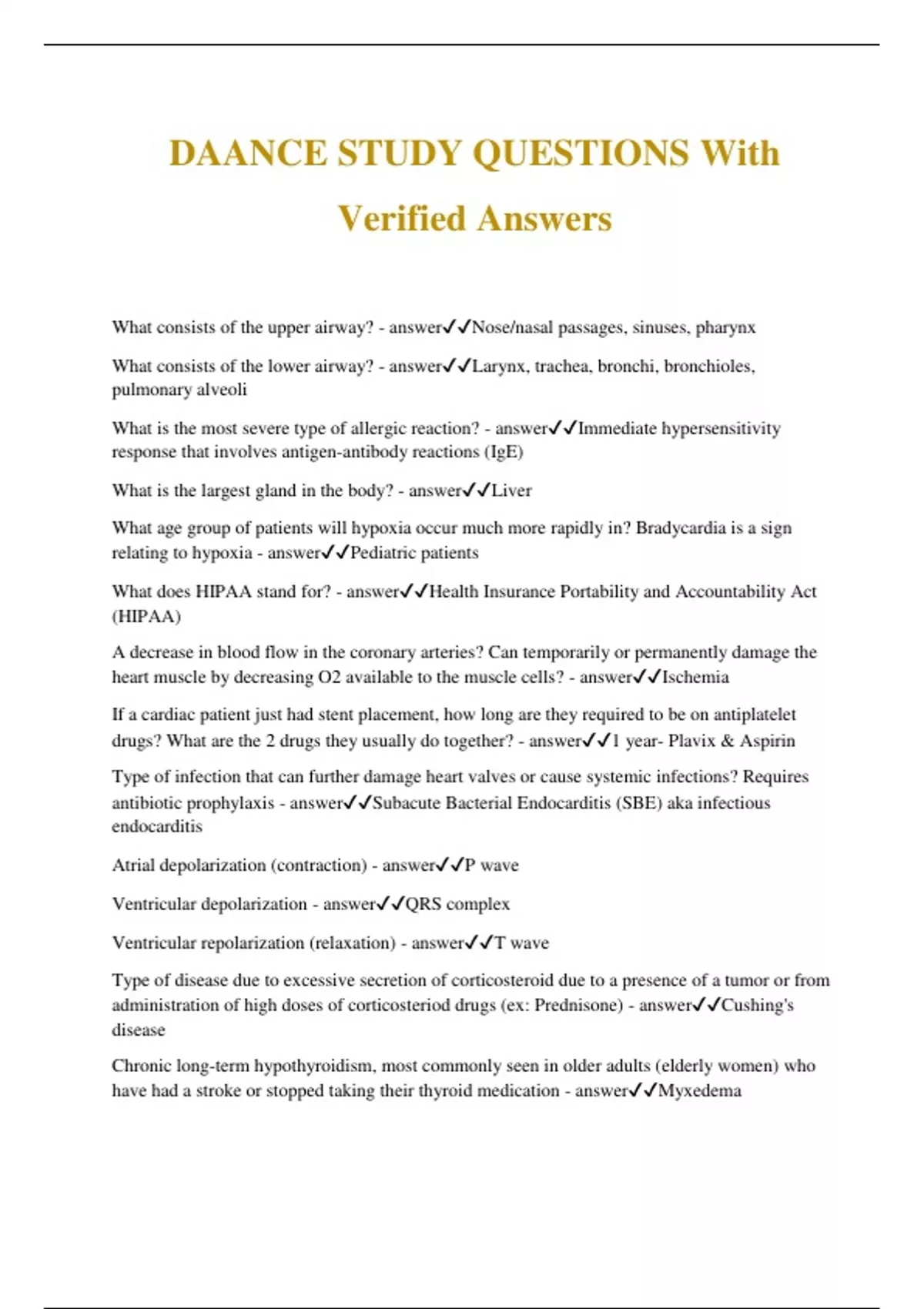 DAANCE STUDY QUESTIONS With Verified Answers What consists of the upper airway? - answerNose/nasal passages, sinuses, pharynx What consists of the lower airway? - answerLarynx, trachea, bronchi, bronchioles, pulmonary alveoli What is the most severe type of allergic reaction? - answerImmediate hypersensitivity response that involves antigen-antibody reactions (IgE) What is the largest gland in the body? - answerLiver What age group of patients will hypoxia occur much more rapidly in? Bradycardia is a sign relating to hypoxia - answerPediatric patients What does HIPAA stand for? - answerHealth Insurance Portability and Accountability Act (HIPAA) A decrease in blood flow in the coronary arteries? Can temporarily or permanently damage the heart muscle by decreasing O2 available to the muscle cells? - answerIschemia If a cardiac patient just had stent placement, how long are they required to be on antiplatelet drugs? What are the 2 drugs they usually do together? - answer1 year- Plavix & Aspirin Type of infection that can further damage heart valves or cause systemic infections? Requires antibiotic prophylaxis - answerSubacute Bacterial Endocarditis (SBE) aka infectious endocarditis Atrial depolarization (contraction) - answerP wave Ventricular depolarization - answerQRS complex Ventricular repolarization (relaxation) - answerT wave Type of disease due to excessive secretion of corticosteroid due to a presence of a tumor or from administration of high doses of corticosteriod drugs (ex: Prednisone) - answerCushing's disease Chronic long-term hypothyroidism, most commonly seen in older adults (elderly women) who have had a stroke or stopped taking their thyroid medication - answerMyxedema Most severe complication of hyperthyroidism from an OMS perspective - answerThyroid crisis Untreated __________ are at an increased risk for outpatient anesthesia and tend to be sensitive to epinephrine in a local anesthetic - answerHyperthyroidism Insulin-dependent - answerDiabetes Type 1 Non-insulin dependent - answerDiabetes Type 2 Elevated level of several liver enzymes and bilirubin is often termed? - answerElevated LFTs (Liver function tests) What gender is Propofol more rapidly redistributed in and require 10-15% larger dose? - answerWomen What age group would Propofol redistribute very rapidly, and require at least 50% increase in drug dose? - answerChildren What is a complication of N2O rapidly moving from blood to alveoli of lungs, and displaces other gases, including O2 - answerDiffusion hypoxia Patient is not aroused, even during painful stimulation. Required airway intervention & cardiovascular function is impaired - answerGeneral anesthesia Can't be easily aroused, purposeful response to pain, and requires airway assistance - answerDeep sedation/analgesia Response to verbal or light tactile touch with no compromise of airway - answerModerate sedation (conscious sedation) Normal response to verbal stimulation with airway reflexes, ventiliation & cardiovascular functions are unaffected - answerMinimal sedation (anxiolysis) What drugs are given for minimal sedation (anxiolysis) - answerValium or Versed Anesthesia that relies on the use of several agents together to benefit from each other. Using each drug at a smaller dose than required if it were being used alone - answerBalanced anesthesia Maximum does of Epi for a healthy patient? - answer0.2 mg What is the treatment for Malignant Hyperthermia? - answer100% O2, Dantrolene (2.5 mg/kg) and IV cold saline (NOT Ringer's) What emergency would a beta blocker be given? - answerHypertension What is the maximum dose of Epi for a patient with cardiovascular disease? - answer0.04 mg