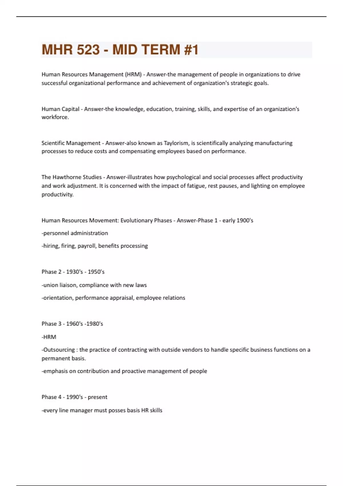 MHR 523 - MID TERM #1 QUESTIONS & ANSWERS SOLVED 100% CORRECT!