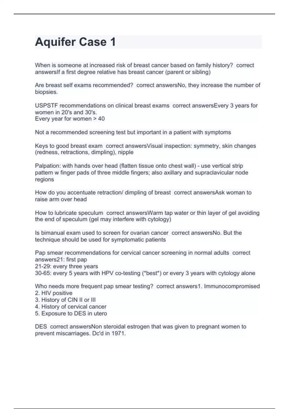 When is someone at increased risk of breast cancer based on family history? correct answersIf a first degree relative has breast cancer (parent or sibling) Are breast self exams recommended? correct answersNo, they increase the number of biopsies. USPSTF recommendations on clinical breast exams correct answersEvery 3 years for women in 20's and 30's. Every year for women > 40 Not a recommended screening test but important in a patient with symptoms Keys to good breast exam correct answersVisual inspection: symmetry, skin changes (redness, retractions, dimpling), nipple Palpation: with hands over head (flatten tissue onto chest wall) - use vertical strip pattern w finger pads of three middle fingers; also axillary and supraclavicular node regions How do you accentuate retraction/ dimpling of breast correct answersAsk woman to raise arm over head How to lubricate speculum correct answersWarm tap water or thin layer of gel avoiding the end of speculum (gel may interfere with cytology) Is bimanual exam used to screen for ovarian cancer correct answersNo. But the technique should be used for symptomatic patients Pap smear recommendations for cervical cancer screening in normal adults correct answers21: first pap 21-29: every three years 30-65: every 5 years with HPV co-testing (*best*) or every 3 years with cytology alone Who needs more frequent pap smear testing? correct answers1. Immunocompromised 2. HIV positive 3. History of CIN II or III 4. History of cervical cancer 5. Exposure to DES in utero DES correct answersNon steroidal estrogen that was given to pregnant women to prevent miscarriages. Dc'd in 1971.