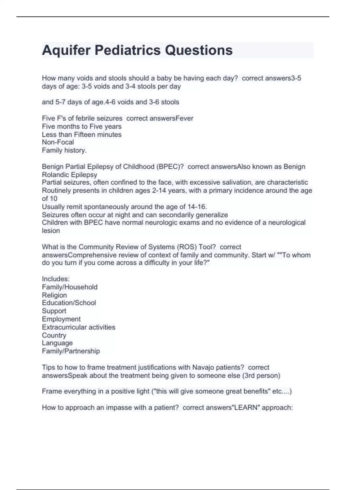 How many voids and stools should a baby be having each day? correct answers3-5 days of age: 3-5 voids and 3-4 stools per day and 5-7 days of age.4-6 voids and 3-6 stools Five F's of febrile seizures correct answersFever Five months to Five years Less than Fifteen minutes Non-Focal Family history. Benign Partial Epilepsy of Childhood (BPEC)? correct answersAlso known as Benign Rolandic Epilepsy Partial seizures, often confined to the face, with excessive salivation, are characteristic Routinely presents in children ages 2-14 years, with a primary incidence around the age of 10 Usually remit spontaneously around the age of 14-16. Seizures often occur at night and can secondarily generalize Children with BPEC have normal neurologic exams and no evidence of a neurological lesion What is the Community Review of Systems (ROS) Tool? correct answersComprehensive review of context of family and community. Start w/ ""To whom do you turn if you come across a difficulty in your life?" Includes: Family/Household Religion Education/School Support Employment Extracurricular activities Country Language Family/Partnership Tips to how to frame treatment justifications with Navajo patients? correct answersSpeak about the treatment being given to someone else (3rd person) Frame everything in a positive light ("this will give someone great benefits" etc....) How to approach an impasse with a patient? correct answers"LEARN" a