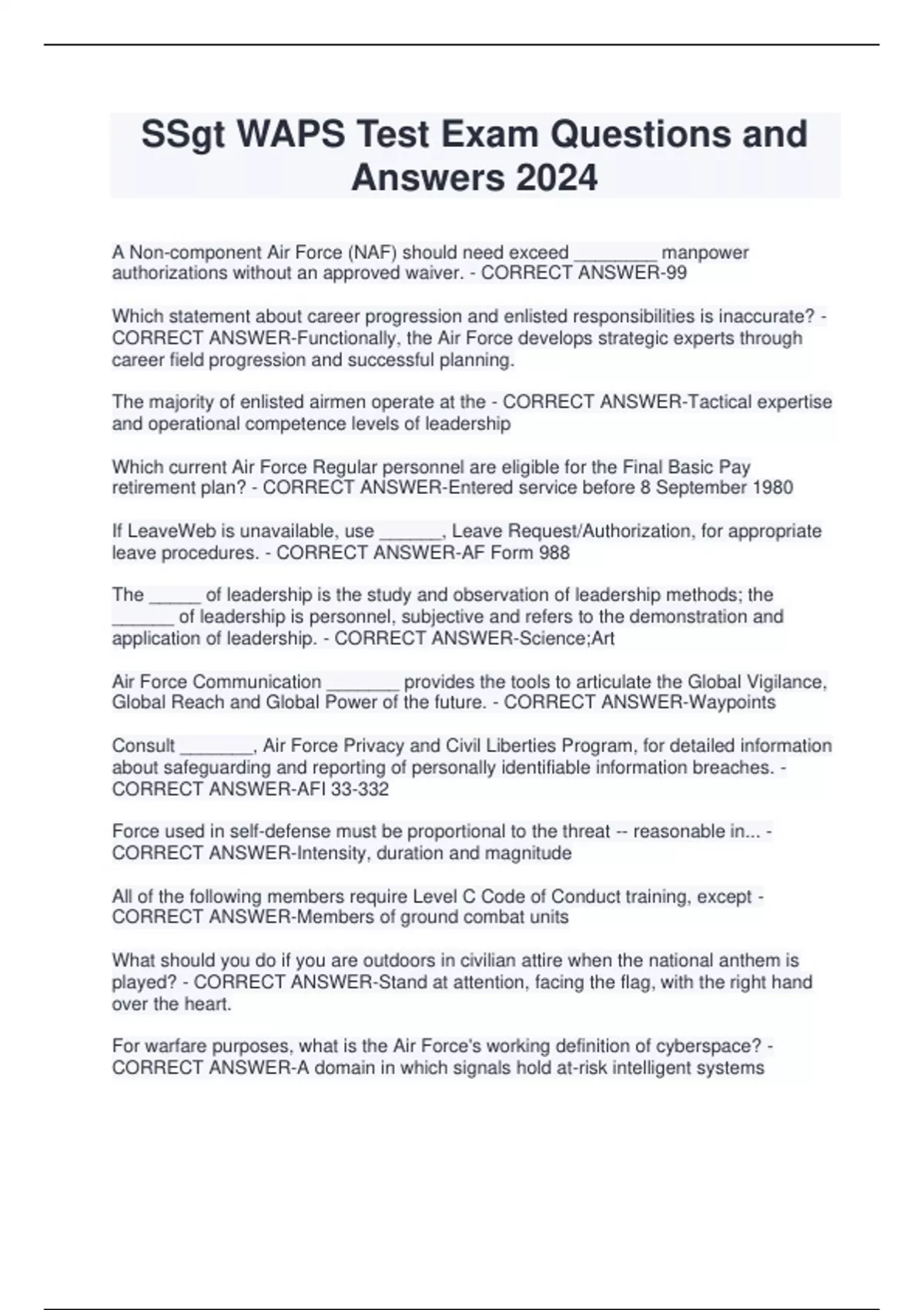 SSgt WAPS Test Exam Questions and Answers 2024 A Non-component Air Force (NAF) should need exceed ________ manpower authorizations without an approved waiver. - CORRECT ANSWER-99 Which statement about career progression and enlisted responsibilities is inaccurate? - CORRECT ANSWER-Functionally, the Air Force develops strategic experts through career field progression and successful planning. The majority of enlisted airmen operate at the - CORRECT ANSWER-Tactical expertise and operational competence levels of leadership Which current Air Force Regular personnel are eligible for the Final Basic Pay retirement plan? - CORRECT ANSWER-Entered service before 8 September 1980 If LeaveWeb is unavailable, use ______, Leave Request/Authorization, for appropriate leave procedures. - CORRECT ANSWER-AF Form 988 The _____ of leadership is the study and observation of leadership methods; the ______ of leadership is personnel, subjective and refers to the demonstration and application of leadership. - CORRECT ANSWER-Science;Art Air Force Communication _______ provides the tools to articulate the Global Vigilance, Global Reach and Global Power of the future. - CORRECT ANSWER-Waypoints Consult _______, Air Force Privacy and Civil Liberties Program, for detailed information about safeguarding and reporting of personally identifiable information breaches. - CORRECT ANSWER-AFI 33-332 Force used in self-defense must be proportional to the threat -- reasonable in... - CORRECT ANSWER-Intensity, duration and magnitude All of the following members require Level C Code of Conduct training, except - CORRECT ANSWER-Members of ground combat units What should you do if you are outdoors in civilian attire when the national anthem is played? - CORRECT ANSWER-Stand at attention, facing the flag, with the right hand over the heart. For warfare purposes, what is the Air Force's working definition of cyberspace? - CORRECT ANSWER-A domain in which signals hold at-risk intelligent systems The Air Force employs all of the following distinctive capabilities to achieve strategic, operational and tactical objectives unhindered by time, distance and geography except - CORRECT ANSWER-Cyber Superiority ______ is a life-cycle approach to developing innovative Airmen who lead in a rapidly evolving global environment and accomplish the Air Force mission - CORRECT ANSWER-Enlisted Force Development All of the following are true about the WAPS except - CORRECT ANSWER-The Air Force makes promotion selections under the WAPS across AFSCs. Reason: they are within, not across AFSCs Duty deferments may be available to help the Air Force military members develop a family care plan and establish a pattern of childcare. How long is the usual deferment period? - CORRECT ANSWER-Four months What are the usual cutoff dates for processing pay? - CORRECT ANSWER-Around the 6th for mid-month and the 20th for end of month