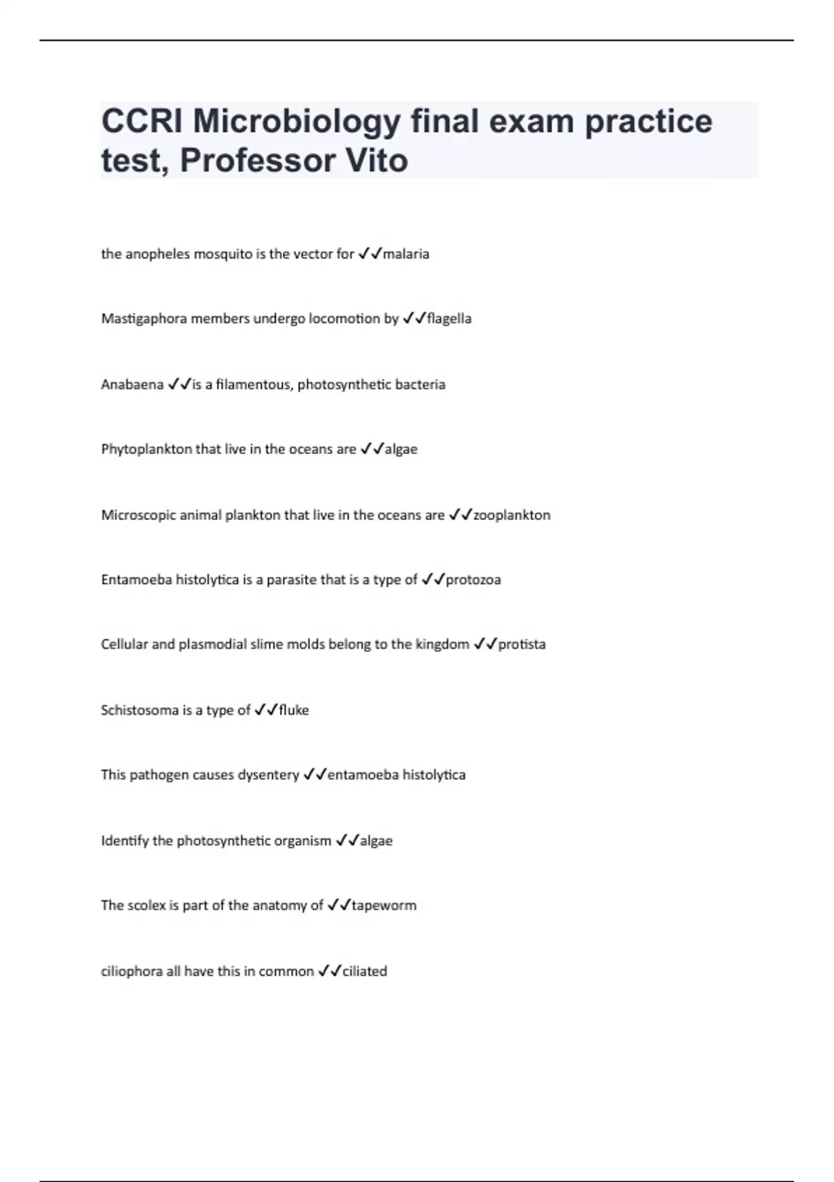 the anopheles mosquito is the vector for malaria Mastigaphora members undergo locomotion by flagella Anabaena is a filamentous, photosynthetic bacteria Phytoplankton that live in the oceans are algae Microscopic animal plankton that live in the oceans are zooplankton Entamoeba histolytica is a parasite that is a type of protozoa Cellular and plasmodial slime molds belong to the kingdom protista Schistosoma is a type of fluke This pathogen causes dysentery entamoeba histolytica Identify the photosynthetic organism algae The scolex is part of the anatomy of tapeworm ciliophora all have this in common ciliated
