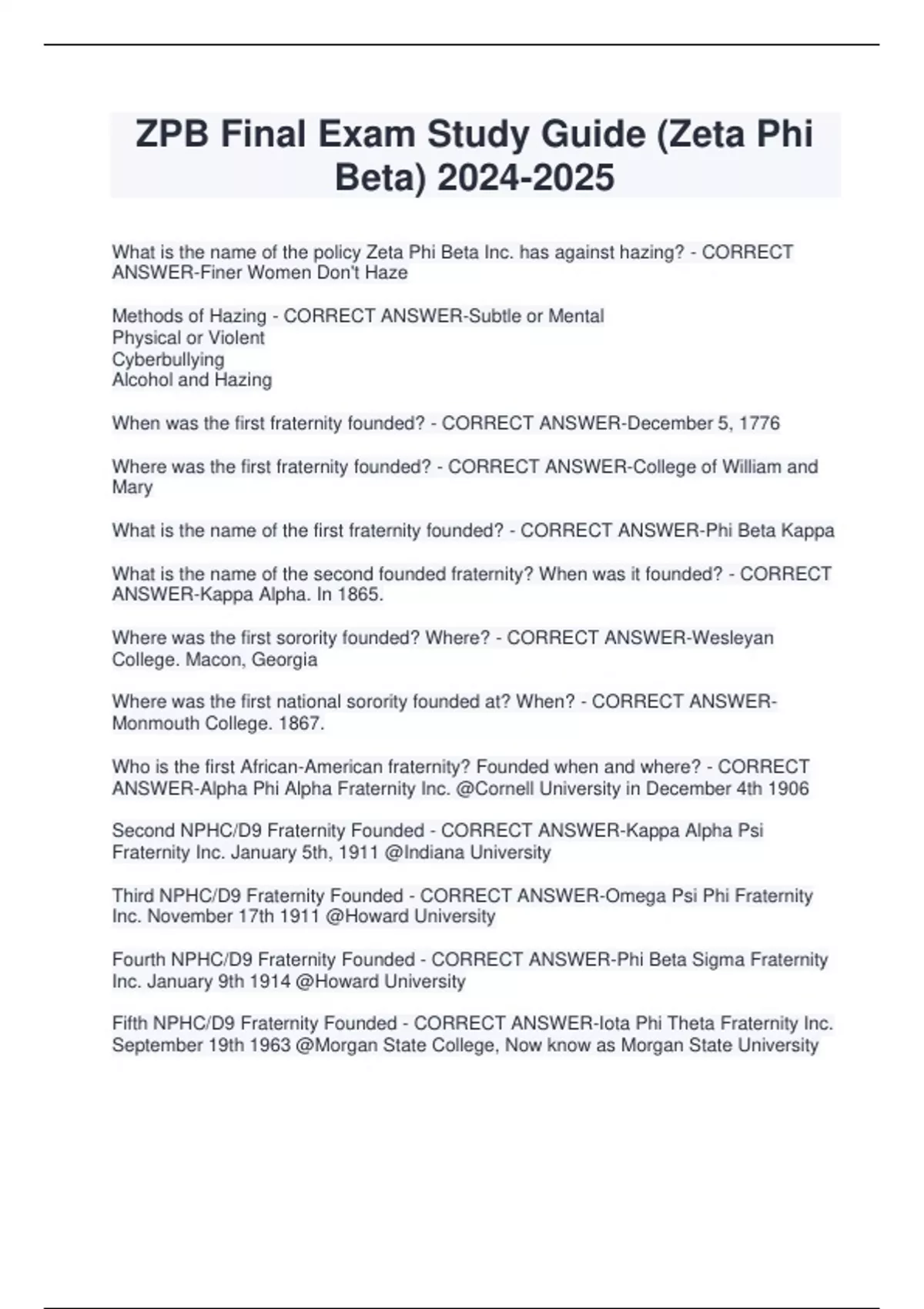 What is the name of the policy Zeta Phi Beta Inc. has against hazing? - CORRECT ANSWER-Finer Women Don't Haze Methods of Hazing - CORRECT ANSWER-Subtle or Mental Physical or Violent Cyberbullying Alcohol and Hazing When was the first fraternity founded? - CORRECT ANSWER-December 5, 1776 Where was the first fraternity founded? - CORRECT ANSWER-College of William and Mary What is the name of the first fraternity founded? - CORRECT ANSWER-Phi Beta Kappa What is the name of the second founded fraternity? When was it founded? - CORRECT ANSWER-Kappa Alpha. In 1865. Where was the first sorority founded? Where? - CORRECT ANSWER-Wesleyan College. Macon, Georgia Where was the first national sorority founded at? When? - CORRECT ANSWERMonmouth College. 1867. Who is the first African-American fraternity? Founded when and where? - CORRECT ANSWER-Alpha Phi Alpha Fraternity Inc. @Cornell University in December 4th 1906 Second NPHC/D9 Fraternity Founded - CORRECT ANSWER-Kappa Alpha Psi Fraternity Inc. January 5th, 1911 @Indiana University Third NPHC/D9 Fraternity Founded - CORRECT ANSWER-Omega Psi Phi Fraternity Inc. November 17th 1911 @Howard University Fourth NPHC/D9 Fraternity Founded - CORRECT ANSWER-Phi Beta Sigma Fraternity Inc. January 9th 1914 @Howard University Fifth NPHC/D9 Fraternity Founded - CORRECT ANSWER-Iota Phi Theta Fraternity Inc. September 19th 1963 @Morgan State College, Now know as Morgan State University First NPHC/D9 Sorority Founded - CORRECT ANSWER-Alpha Kappa Alpha Sorority Inc. January 15th 1908 @Howard University Second NPHC/D9 Sorority Founded - CORRECT ANSWER-Delta Sigma Theta Sorority Inc. January 13th 1913 @Howard University Third NPHC/D9 Sorority Founded - CORRECT ANSWER-Zeta Phi Beta Sorority Inc. January 16th 1920 @Howard University Fourth NPHC/D9 Sorority Founded - CORRECT ANSWER-Sigma Gamma Rho Sorority Inc. November 12th 1922 @Buter Unive