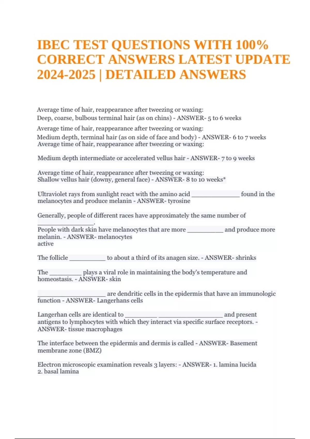 IBEC TEST QUESTIONS WITH 100% CORRECT ANSWERS LATEST UPDATE | DETAILED ANSWERS. Average time of hair, reappearance after tweezing or waxing: Deep, coarse, bulbous terminal hair (as on chins) - ANSWER- 5 to 6 weeks Average time of hair, reappearance after tweezing or waxing: Medium depth, terminal hair (as on side of face and body) - ANSWER- 6 to 7 weeks Average time of hair, reappearance after tweezing or waxing: Medium depth intermediate or accelerated vellus hair - ANSWER- 7 to 9 weeks Average time of hair, reappearance after tweezing or waxing: Shallow vellus hair (downy, general face) - ANSWER- 8 to 10 weeks* Ultraviolet rays from sunlight react with the amino acid ____________ found in the melanocytes and produce melanin - ANSWER- tyrosine Generally, people of different races have approximately the same number of ______________. People with dark skin have melanocytes that are more _________ and produce more melanin. - ANSWER- melanocytes active The follicle _________ to about a third of its anagen size. - ANSWER- shrinks The ________ plays a viral role in maintaining the body's temperature and homeostasis. - ANSWER- skin _________________ are dendritic cells in the epidermis that have an immunologic function - ANSWER- Langerhans cells Langerhan cells are identical to ________ ________________ and present antigens to lymphocytes with which they interact via specific surface receptors. - ANSWER- tissue macrophages The interface between the epidermis and dermis is called - ANSWER- Basement membrane zone (BMZ) Electron microscopic examination reveals 3 layers: - ANSWER- 1. lamina lucida 2. basal lamina IBEC TEST QUESTIONS WITH 100% CORRECT ANSWERS LATEST UPDATE | DETAILED ANSWERS 3. anchoring fibrils Lamina lucida - ANSWER- relatively lucid zone transversed by delicate anchoring filaments that connect the cell membrane of the basal cell with the basal lamina Basal lamina - ANSWER- the basal lamina an electron- dense zone composed primarily of type IV collagen derived from epidermal cells and anchoring fibrils Anchoring fibrils - ANSWER- which are thick fibrous strands, composed primarily of type VII collagen, that complete the connection with the dermis The BMZ - ANSWER- serves as the "glue" between the epidermis and dermis and is the site of blister formation in a number of diseases. It appears that there are two areas of target: - ANSWER- the bulge and the bulb The matrix and papilla house the - ANSWER- bulge and the bulb The total number of follicles is approximately _________ in men and women, and appears to be the same in all races. - ANSWER- equal It is the activity of the ____ _______, rather than their number which determines the amount of growing hair. - ANSWER- hair follicles The most important hormone controlling growth are "____________" commonly known as "male" hormones - ANSWER- androgens The most important hormone is - ANSWER- testosterone In the scalp, androgens cause hair to change from _______ to _____________. - ANSWER- vellus to terminal Once _________ hair has been transformed into terminal hair, it cannot change back even if androgen disappear. Therefore, ____________ must be treated promptly to minimize the number of terminal hairs induced by the excess androgens. - ANSWER- vellus hirsutism Electrolysis should not be performed until hormonal therapy has been used fir at least. Otherwise, it will result in an endless "chasing" of new coarse hairs throughout the body - ANSWER- 6 months. Sexual hair i.e,, facial, ear, chest, abdominal, pubic and axillary, is ______________ dependent and this hormone is primarily ______________, which is converted to dihydrotestosterone before it becomes effective. - ANSWER- hormone dependent testosterone In 1996, Rox Anderson - ANSWER- discovered that it was possible to selectively target a specific chromophore with laser to destroy hair follicles. Stimulated emission - ANSWER- phenomenon that is produced inside a laser. When electrons are stimulated repeatedly by energy, they will force a proton to jump off in a wave form and return to their resting state. Amplification - ANSWER- a laser beam is generated by amplification; which is stimulated emission repeated innumerable times resulting in a laser beam. Wavelength is measured in __________ when dealing with lasers and IPLs - ANSWER- nanometers One nanometers is ____ __________ of a millimeter - ANSWER- 1/1 millionth; usually one billionth of a nanometer Ruby = - ANSWER- 694nm Alexandrite = - ANSWER- 755nm Diode = - ANSWER- 810nm ND Yag = - ANSWER- 1064nm Basic Laser and IPL Parameters - ANSWER- Wavelength Pulse Width Spot size Fluence Laser VS. IPL - ANSWER- LASER -monochromatic -coherent -collimated IPL -polychromatic -divergent (incoherent) -non-collimated Wavelength - ANSWER- is determined by the distance between two peaks and is measured in nanometers (nm) Chromophore/target - ANSWER- the lower on the spectrum of light the higher the attraction to melanin and oxyhemoglobin Depth of penetration is dependent on - ANSWER- wavelength and spot size Lower the spectrum the _____________ the penetration - ANSWER- shallower The higher on the spectrum, the ____________ the penetration - ANSWER- deeper Pulse Width - ANSWER- the amount of time energy is directed to a target. Pulse width is measured in - ANSWER- milliseconds or nanoseconds Pulse width is time on - ANSWER- target The maximum energy output is determined by - ANSWER- spot size Energy is limited by the size of the spot size on all devices for added safety. Large spot size allows for _________ penetration and _____ scatter. Smaller spot size results in a ____________ penetration with ______ scatter - ANSWER- deeper penetration and less scatter shallower penetration with more scatter.