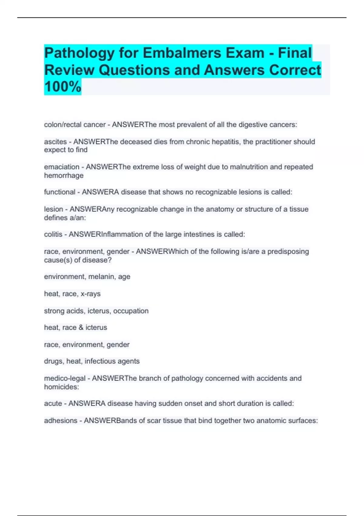Pathology for Embalmers Exam - Final Review Questions and Answers Correct 100% emaciation - ANSWERThe extreme loss of weight due to malnutrition and repeated hemorrhage colon/rectal cancer - ANSWERThe most prevalent of all the digestive cancers: ascites - ANSWERThe deceased dies from chronic hepatitis, the practitioner should expect to find emaciation - ANSWERThe extreme loss of weight due to malnutrition and repeated hemorrhage functional - ANSWERA disease that shows no recognizable lesions is called: lesion - ANSWERAny recognizable change in the anatomy or structure of a tissue defines a/an: colitis - ANSWERInflammation of the large intestines is called: race, environment, gender - ANSWERWhich of the following is/are a predisposing cause(s) of disease? environment, melanin, age heat, race, x-rays strong acids, icterus, occupation heat, race & icterus race, environment, gender drugs, heat, infectious agents medico-legal - ANSWERThe branch of pathology concerned with accidents and homicides: acute - ANSWERA disease having sudden onset and short duration is called: adhesions - ANSWERBands of scar tissue that bind together two anatomic surfaces: hemorrhoids - ANSWERVaricosity of the veins around the rectum is condition Herpes simplex I, Treponema pallidum - ANSWERWhich of the following organism(s) cause stomatitis? Candida albicans, diabetes diabetes, Treponema pallidum Treponema pallidum; streptococcus pneumoniae