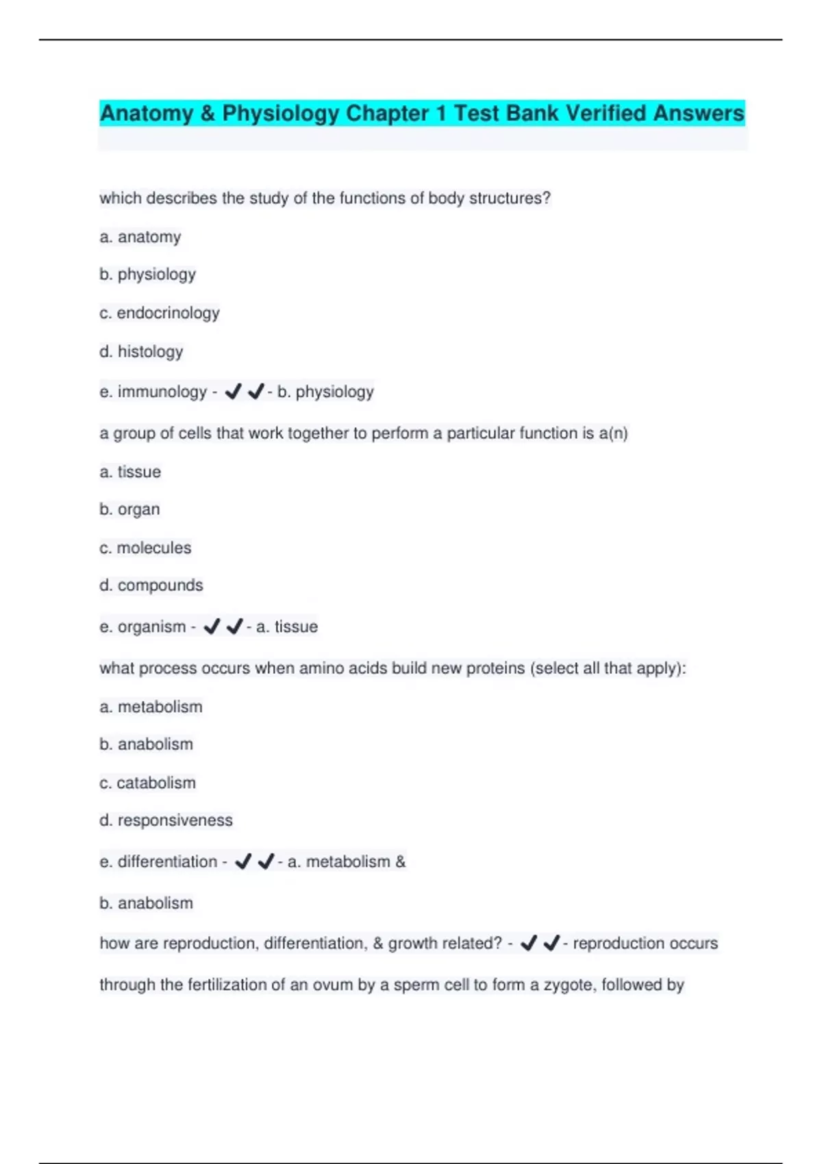 Anatomy & Physiology Chapter 1 Test Bank Verified Answers which describes the study of the functions of body structures? a. anatomy b. physiology c. endocrinology d. histology e. immunology - ️️ - b. physiology a group of cells that work together to perform a particular function is a(n) a. tissue b. organ c. molecules d. compounds e. organism - ️️ - a. tissue what process occurs when amino acids build new proteins (select all that apply): a. metabolism b. anabolism c. catabolism d. responsiveness e. differentiation - ️️ - a. metabolism & b. anabolism how are reproduction, differentiation, & growth related? - ️️ - reproduction occurs through the fertilization of an ovum by a sperm cell to form a zygote, followed by repeated cell divisions & the differentiation of these cells. growth is an increase in body size that results from an increase in the size of existing cells, an increase, in the number of cells, or both. the two organ systems that predominantly regulate & maintain homeostasis are the a. cardiovascular & integumentary systems b. nervous & endocrine systems c. cardiovascular & respiratory systems d. respiratory & muscular systems e. urinary & integumentary systems - ️️ - b. nervous & endocrine systems which body fluid fills the narrow spaces between cells & tissues? a. lymph b. blood plasma c. interstitial fluid e. vitreous body - ️️ - c. interstitial fluid describe the differences between positive & negative feedback systems - ️️ - a positive feedback system will strengthen or reinforce