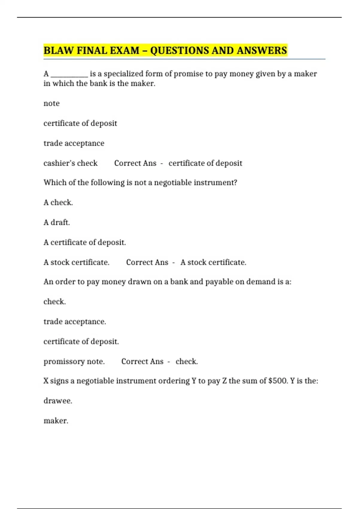 BLAW FINAL EXAM – QUESTIONS AND ANSWERS
