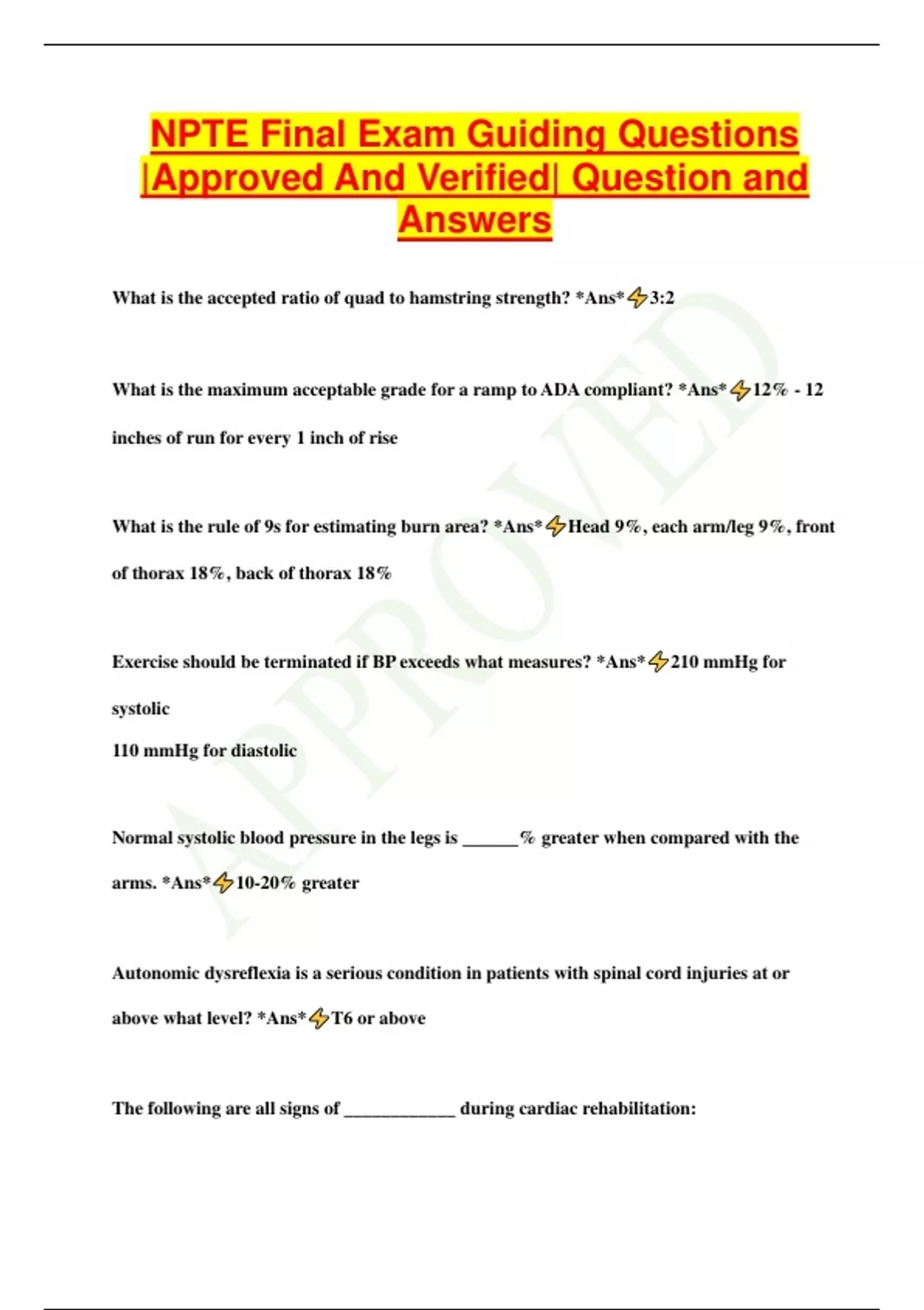 NPTE Final Exam Guiding Questions |Approved And Verified| Question and Answers What is the accepted ratio of quad to hamstring strength? *Ans* 3:2 What is the maximum acceptable grade for a ramp to ADA compliant? *Ans* 12% - 12 inches of run for every 1 inch of rise What is the rule of 9s for estimating burn area? *Ans* Head 9%, each arm/leg 9%, front of thorax 18%, back of thorax 18% Exercise should be terminated if BP exceeds what measures? *Ans* 210 mmHg for systolic 110 mmHg for diastolic Normal systolic blood pressure in the legs is ______% greater when compared with the arms. *Ans* 10-20% greater Autonomic dysreflexia is a serious condition in patients with spinal cord injuries at or above what level? *Ans* T6 or above The following are all signs of ____________ during cardiac rehabilitation: Persistent dyspnea, dizziness, anginal pain, sudden weight gain *Ans* -exertional intolerance Upper or lower motor neuron lesion: 1. A spinal cord tumor at L1 2. A herniated nucleus pulposus at L4 3. Femoral nerve impingement 4. A cauda equina lesion *Ans* 1. Upper 2. Lower 3. Lower 4. Lower Types of incontinence: 1. functional 2. stress 3. urge 4. overflow *Ans* 1. normal bladder but can't make it to bathroom d/t joint pain or mobility issues 2. leakage from pressure like coughing, lifting, or laughing 3. sudden, unexpected urge to go leading to leakage 4. urine leakage from full bladder d/t inability void i.e. spinal cord injury Dermatitis vs cellulitis *Ans* -dermatitis: no fever, normal temp of LEs, TTP, & crusting