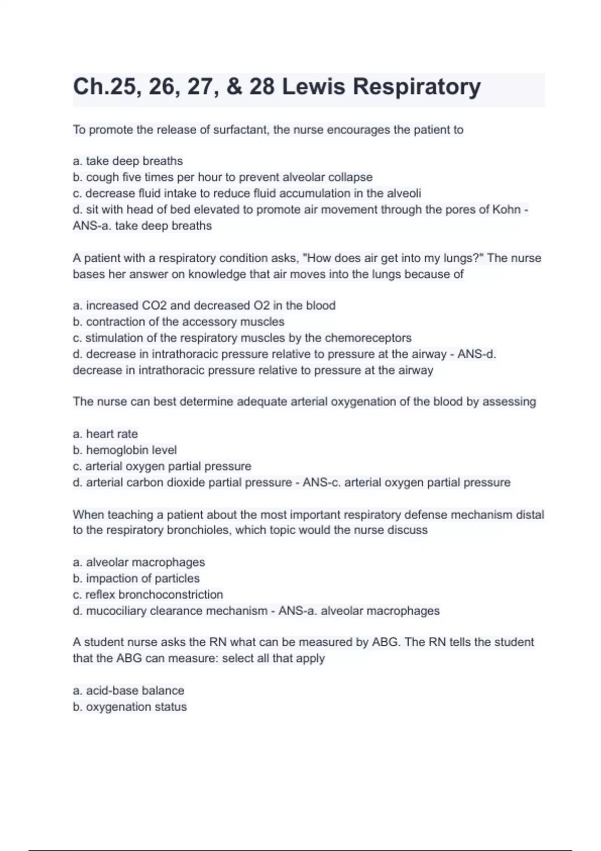 Ch.25, 26, 27, & 28 Lewis Respiratory With complete solution