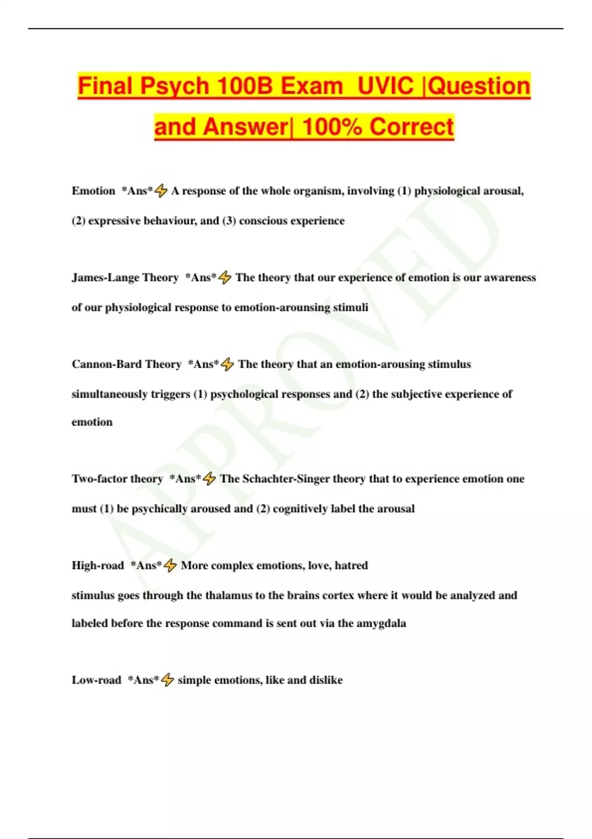 Final Psych 100B Exam UVIC |Question and Answer| 100% Correct Emotion *Ans* A response of the whole organism, involving (1) physiological arousal, (2) expressive behaviour, and (3) conscious experience James-Lange Theory *Ans* The theory that our experience of emotion is our awareness of our physiological response to emotion-arounsing stimuli Cannon-Bard Theory *Ans* The theory that an emotion-arousing stimulus simultaneously triggers (1) psychological responses and (2) the subjective experience of emotion Two-factor theory *Ans* The Schachter-Singer theory that to experience emotion one must (1) be psychically aroused and (2) cognitively label the arousal High-road *Ans* More complex emotions, love, hatred stimulus goes through the thalamus to the brains cortex where it would be analyzed and labeled before the response command is sent out via the amygdala Low-road *Ans* simple emotions, like and dislike bypasses the cortex and goes directly from the stimulus through the thalamus and to the amygdala Positive emotions trigger *Ans* left frontal lobe activity Depressed people show more *Ans* right frontal lobe activity Polygraph *Ans* a machine, commonly used in attempts to detect lies, that measures several of the physiological responses accompanying emotion Facial feedback effect *Ans* the tendency of facial muscle states to trigger corresponding feelings such as fear, anger, or happiness behavioural feedback effect *Ans* the tendency of behaviour to influence our own and others' thoughts, feelings, and actions Catharsis *Ans* emotional release. In psychology, the catharsis hypothesis maintains that "releasing" aggressive energy relieves aggressive urges Best way to manage anger *Ans* wait, find a healthy destruction, distance yourself, Feel-good, do-good phenomenon *Ans* peoples tendency to be helpful when they are already in a good mood Positive psychology *Ans* The scientific study of human flourishing, with the goals of discovering and promoting strengths and virtues that help individuals and communities to thrive Subjective well-being *Ans* self-perceived happiness or satisfaction with life. Used salmon with measures of objective well-being to evaluate peoples quality of life Adoption level phenomenon *Ans* our tendency to form judgments relative t