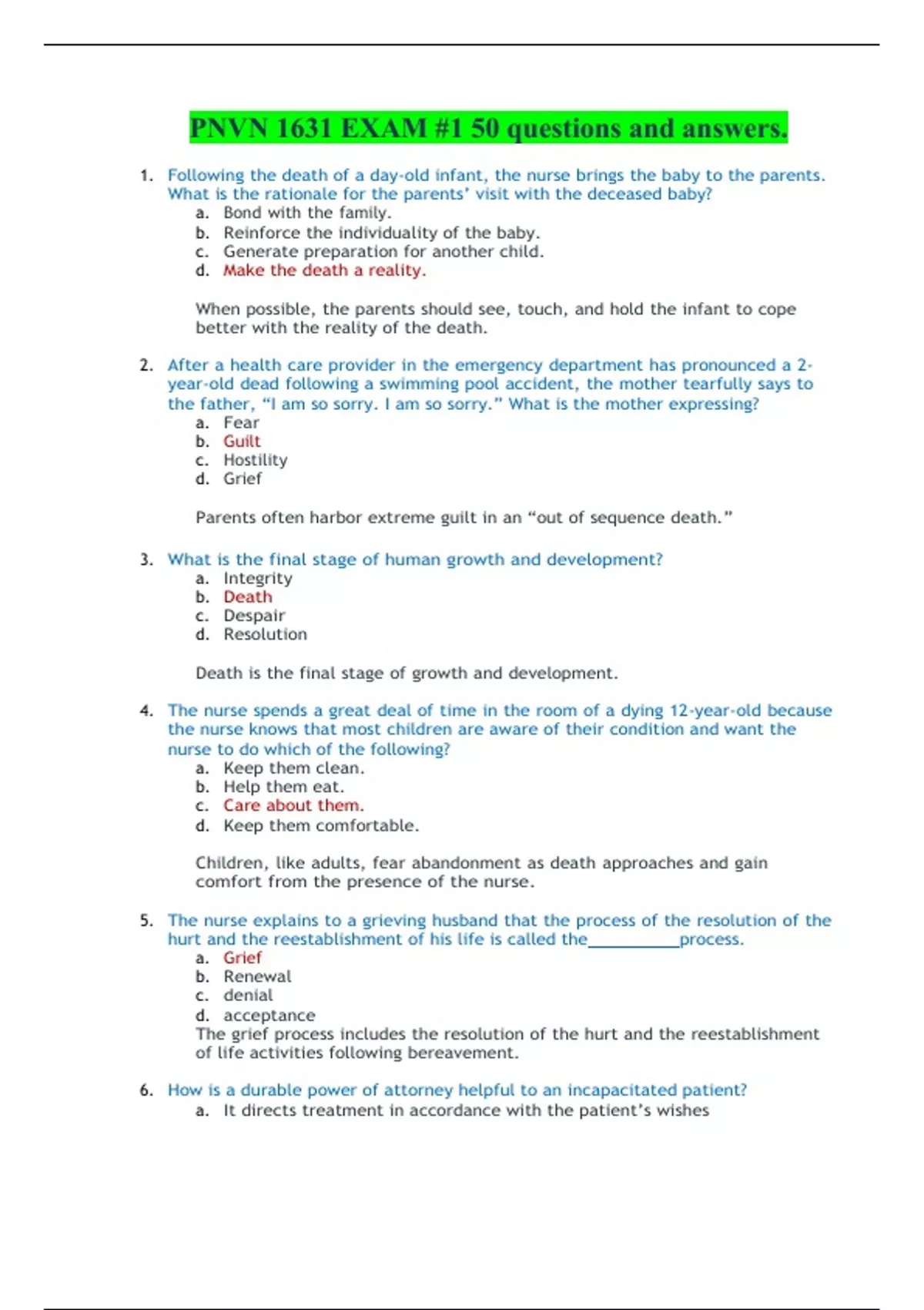 PNVN 1631 EXAM #1 50 questions and answers. 1. Following the death of a day-old infant, the nurse brings the baby to the parents. What is the rationale for the parents’ visit with the deceased baby? a. Bond with the family. b. Reinforce the individuality of the baby. c. Generate preparation for another child. d. Make the death a reality. When possible, the parents should see, touch, and hold the infant to cope better with the reality of the death. 2. After a health care provider in the emergency department has pronounced a 2- year-old dead following a swimming pool accident, the mother tearfully says to the father, “I am so sorry. I am so sorry.” What is the mother expressing? a. Fear b. Guilt c. Hostility d. Grief Parents often harbor extreme guilt in an “out of sequence death.” 3. What is the final stage of human growth and development? a. Integrity b. Death c. Despair d. Resolution Death is the final stage of growth and development. 4. The nurse spends a great deal of time in the room of a dying 12-year-old because the nurse knows that most children are aware of their condition and want the nurse to do which of the following? a. Keep them clean. b. Help them eat. c. Care about them. d. Keep them comfortable. Children, like adults, fear abandonment as death approaches and gain comfort from the presence of the nurse. 5. The nurse explains to a grieving husband that the process of the resolution of the hurt and the reestablishment of his life is called the process. a. Grief b. Renewal c. denial d. acceptance The grief process includes the resolution of the hurt and the reestablishment of life activities following bereavement. 6. How is a durable power of attorney helpful to an incapacitated patient? a. It directs treatment in accordance with the patient’s wishes b. It directs an agent to make health care decisions. c. It gives power to an agent to make decisions regarding health, property, and other assets. d. It can only be executed by an attorney. The durable power of attorney gives an agent the power to make health care decisions. It can be executed by anyone and does not extend beyond health care issues. A living will directs treatment according to the patient’s wishes. 7. Changes in health care reimbursement measures have resulted in which of the following changes regarding care of the terminally ill? a. Patients spend more time in hospitals. b. Nurses provide more care in hospitals. c. More patients die at home. d. Patients spend more time in rehab facilities. Due to changes in reimbursement measures, more patients are dying at home. 8. A patient whose spouse died 1 year earlier complains of feeling overwhelmingly lonely and has withdrawn from interpersonal interactions. The patient is demonstrating what stage of dying according to Kübler-Ross’s stages of dying theory? a. Anger b. Denial c. Depression d. Bargaining When experiencing depression, the individual feels overwhelmingly lonely and withdraws from interpersonal interaction 9. When a nurse informs a patient’s spouse that the patient has died, the spouse states, “You must be mistaken.” Which of Kübler-Ross’s stages of dying is the spouse demonstrating? a. Anger b. Denial c. Depression d. Bargaining When experiencing denial, the individual acts as though nothing has happened and may refuse to believe or understand that loss has occurred. 10. Which of the following would lead the home health nurse to make a patient problem of unresolved grief for a patient who was widowed 5 months ago? a. Seeing that the patient keeps a picture of the husband by her bed. b. The patient said tearfully, “I can’t believe he is gone.” c. Assessing that the patient eats out frequently rather than cooking at home. d. The patient says that she attends church three times a week. Unresolved grief results when a grieving person does not move past some stage of the grief process. The widow is still in denial. It would be expected for the widow to keep pictures of her husband in the home. Eating out frequently and attending church would not lead to a diagnosis of unresolved grief, but instead would be encouraged. 11. Changes in health care reimbursement measures have resulted in which of the following changes regarding care of the terminally ill? a. Patients spend more time in hospitals. b. Nurses provide more care in hospitals. c. More patients die at home. d. Patients spend more time in rehab facilities. Due to changes in reimbursement measures, more patients are dying at home. 12. The nurse is aware that the symptoms of an impending myocardial infarction (MI) differ in women because acute chest pain is not present. Women are frequently misdiagnosed as having: a. hepatitis A. b. indigestion. c. urinary infection. d. menopausal complications. Indigestion, gallblad
