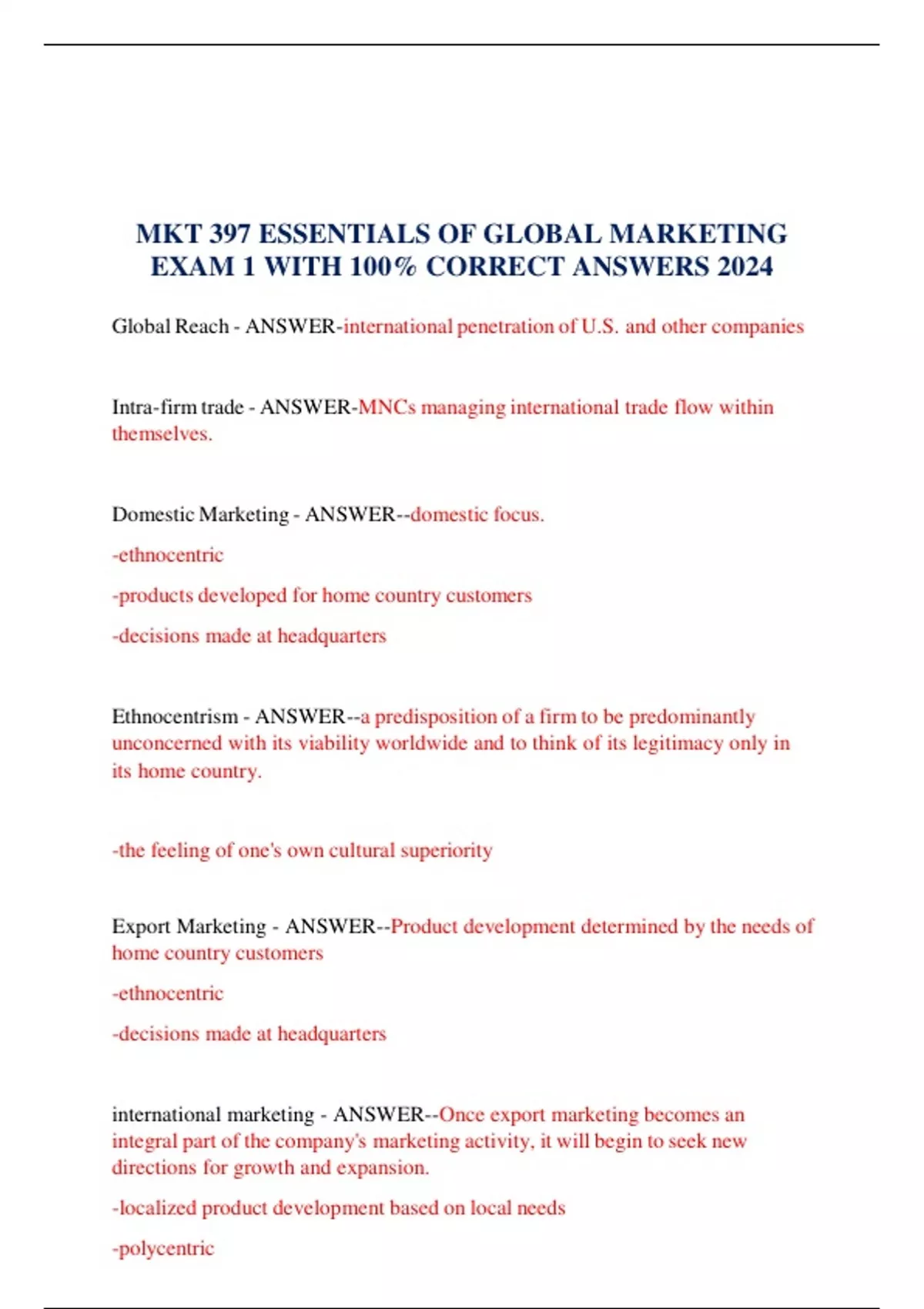 MKT 397 ESSENTIALS OF GLOBAL MARKETING EXAM 1 WITH 100% CORRECT ANSWERS 2024