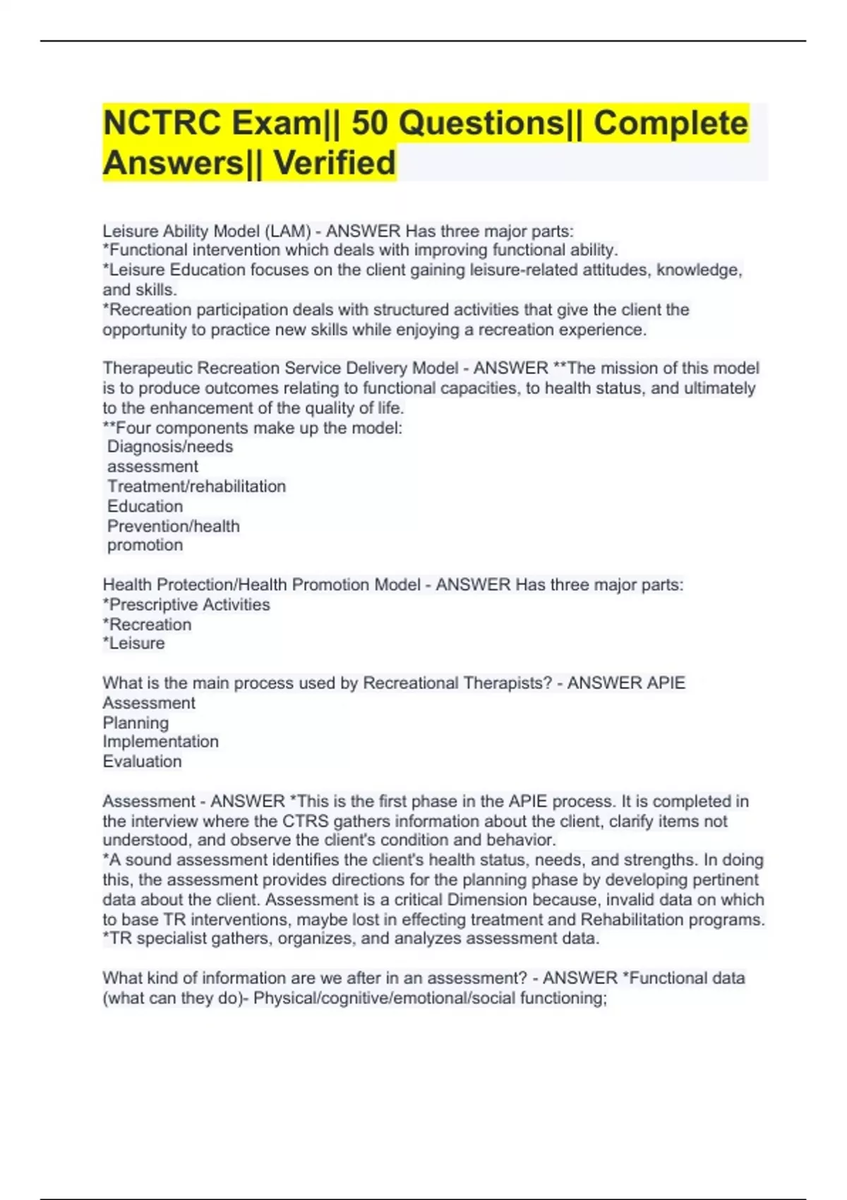 Leisure Ability Model (LAM) - ANSWER Has three major parts: *Functional intervention which deals with improving functional ability. *Leisure Education focuses on the client gaining leisure-related attitudes, knowledge, and skills. *Recreation participation deals with structured activities that give the client the opportunity to practice new skills while enjoying a recreation experience. Therapeutic Recreation Service Delivery Model - ANSWER **The mission of this model is to produce outcomes relating to functional capacities, to health status, and ultimately to the enhancement of the quality of life. **Four components make up the model: Diagnosis/needs assessment Treatment/rehabilitation Education Prevention/health promotion Health Protection/Health Promotion Model - ANSWER Has three major parts: *Prescriptive Activities *Recreation