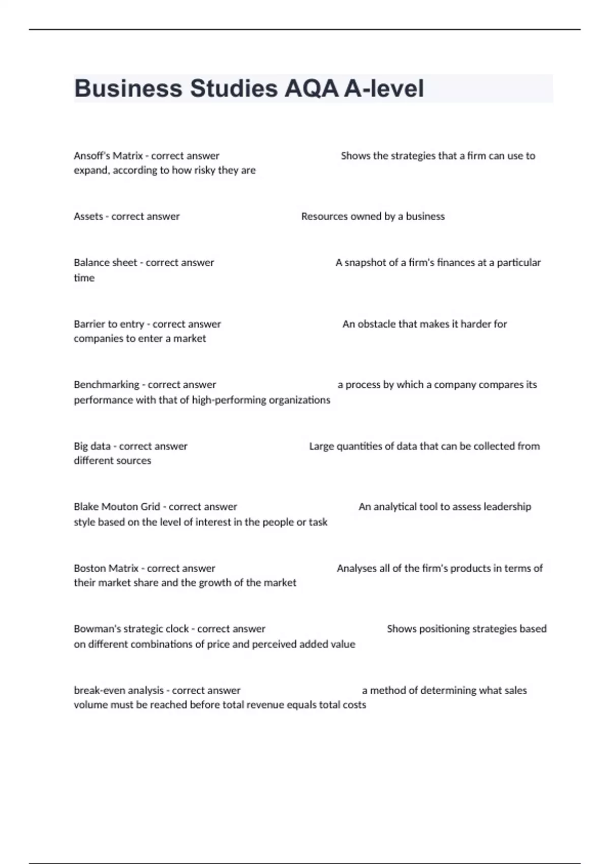Ansoff's Matrix - correct answer Shows the strategies that a firm can use to expand, according to how risky they are Assets - correct answer Resources owned by a business Balance sheet - correct answer A snapshot of a firm's finances at a particular time Barrier to entry - correct answer An obstacle that makes it harder for companies to enter a market Benchmarking - correct answer a process by which a company compares its performance with that of high-performing organizations Big data - correct answer Large quantities of data that can be collected from different sources Blake Mouton Grid - correct answer An analytical tool to assess leadership style based on the level of interest in the people or task Boston Matrix - correct answer Analyses all of the firm's products in terms of their market share and the growth of the market Bowman's strategic clock - correct answer Shows positioning strategies based on different combinations of price and perceived added value break-even analysis - correct answer a method of determining what sales volume must be reached before total revenue equals total costs Budget - correct answer A plan for making and spending money Capacity utilisation - correct answer The proportion of total capacity that is used (expressed as a percentage) Capital - correct answer a company's wealth in the form of money or property capital expenditures - correct answer Money used to buy fixed assets Carroll's Pyramid of CSR - correct answer A diagram showing four elements of CSR as layers in a pyramid cashflow - correct answer (n) the movement of money into and out of a business as goods are bought and sold Centralization - correct answer decision authority is located near the top of the organization channel of distribution - correct answer a pathway to direct products to consumers competitive advantage - correct answer providing greater value for customers than competitors can confidence interval - correct answer A range in which you can say, with a certain level of confidence, that a value lies Confidence level - correct answer The probability that the research findings are correct Consumer Price Index - correct answer an index of the cost of all goods and services to a typical consumer
