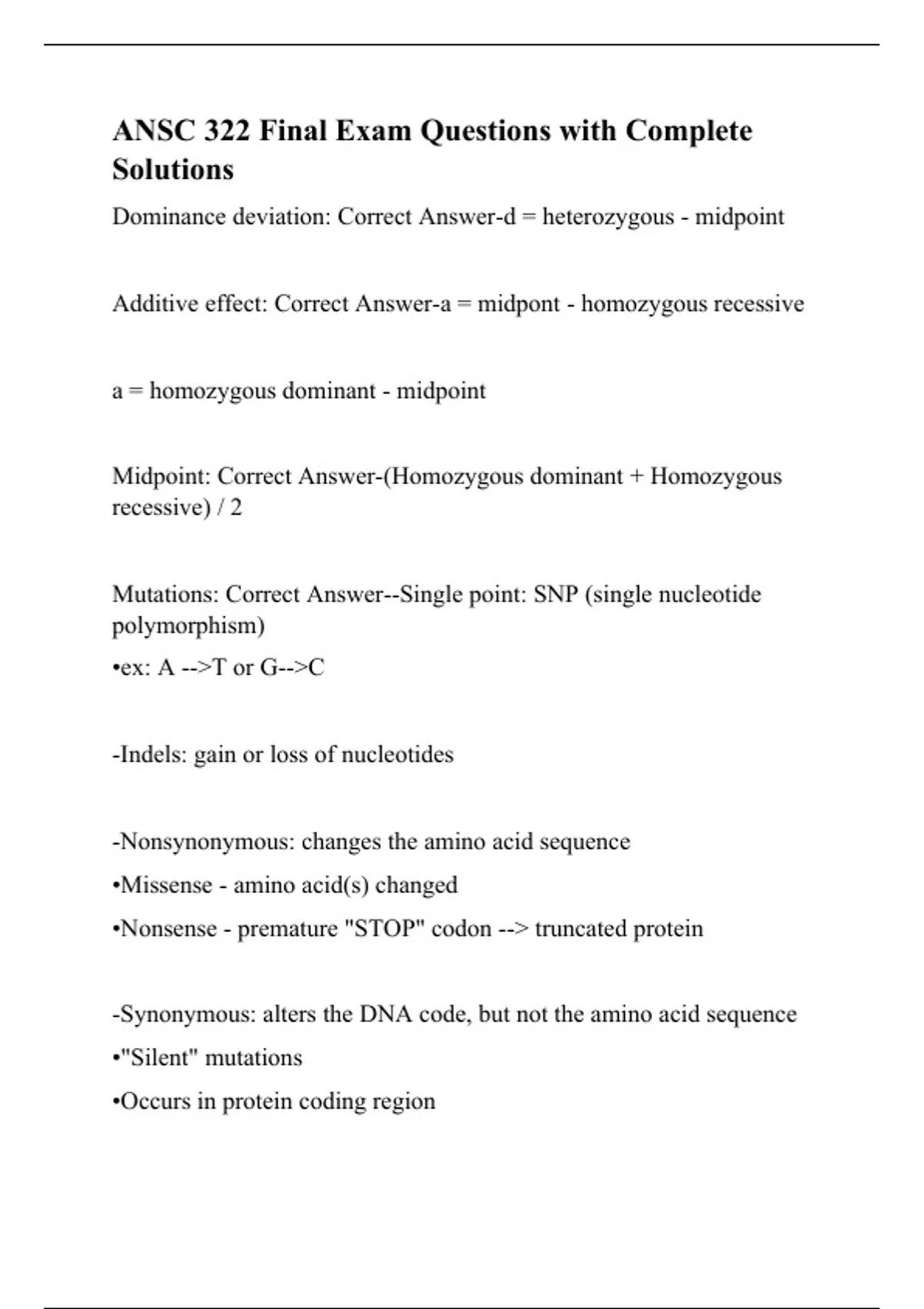 Dominance deviation: Correct Answer-d = heterozygous - midpoint Additive effect: Correct Answer-a = midpont - homozygous recessive a = homozygous dominant - midpoint Midpoint: Correct Answer-(Homozygous dominant + Homozygous recessive) / 2 Mutations: Correct Answer--Single point: SNP (single nucleotide polymorphism) •ex: A -->T or G-->C -Indels: gain or loss of nucleotides -Nonsynonymous: changes the amino acid sequence •Missense - amino acid(s) changed •Nonsense - premature "STOP" codon --> truncated protein -Synonymous: alters the DNA code, but not the amino acid sequence •"Silent" mutations •Occurs in protein coding region