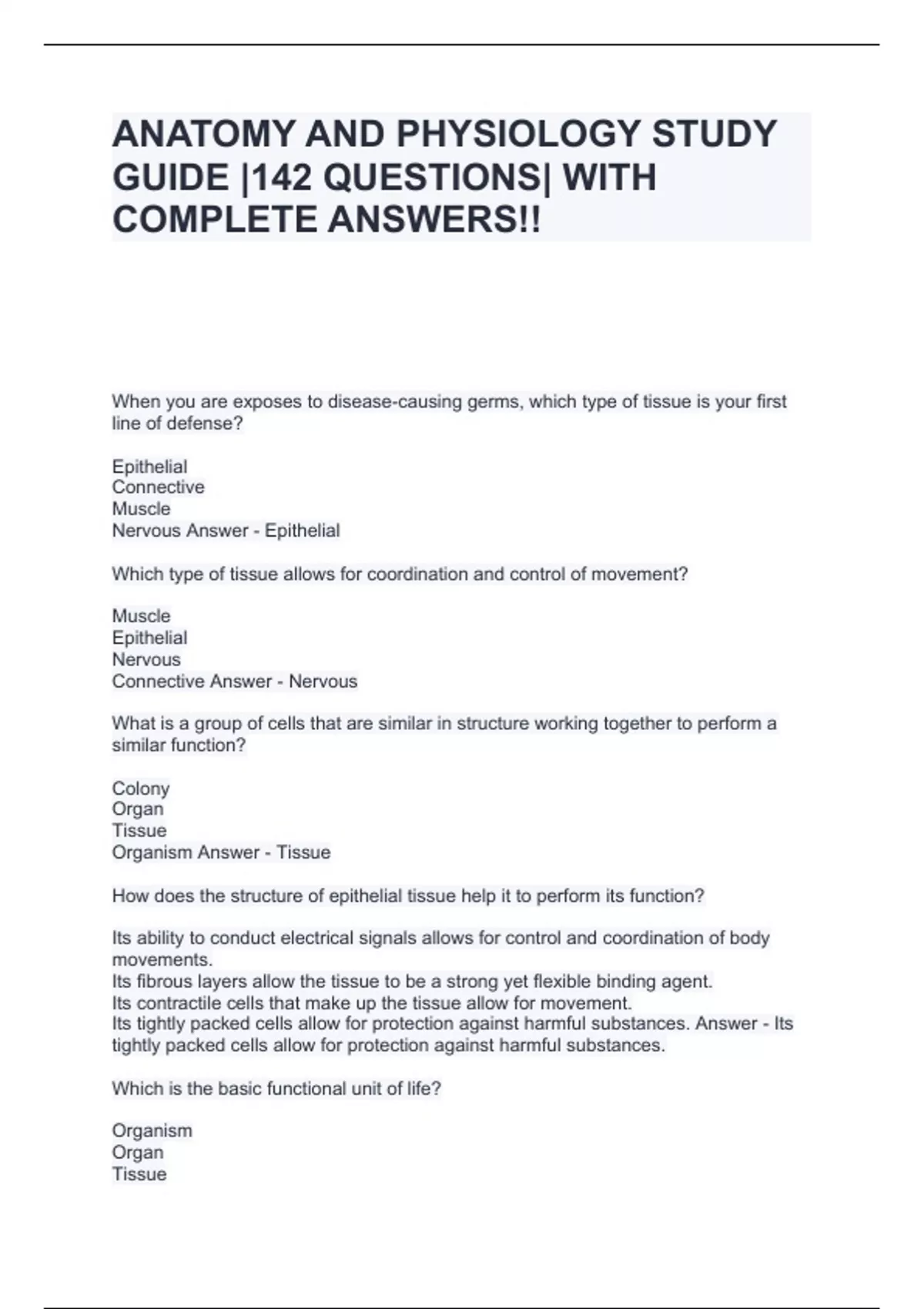 ANATOMY AND PHYSIOLOGY STUDY GUIDE |142 QUESTIONS| WITH COMPLETE ANSWERS!!