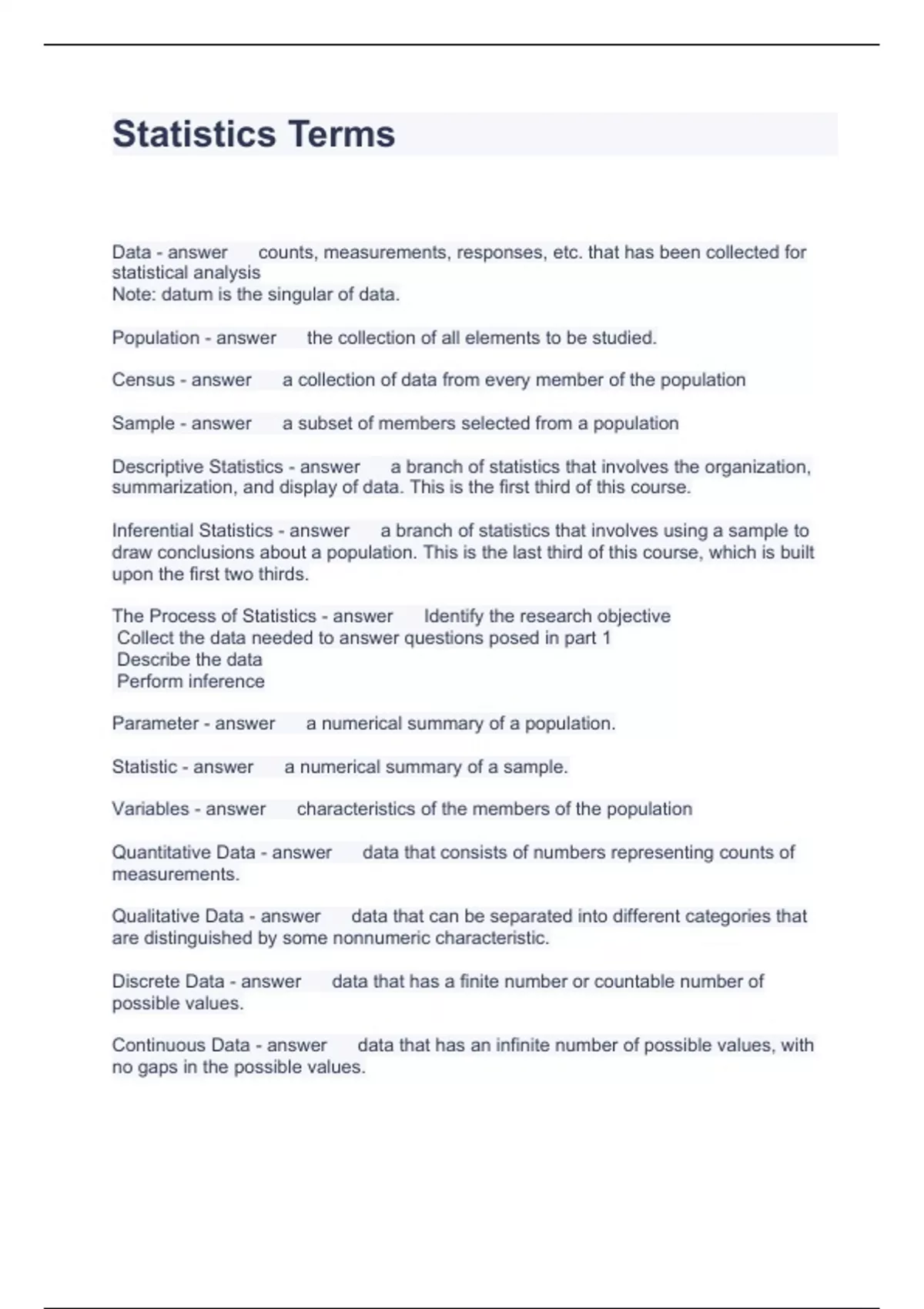 Statistics Terms Questions and Answers 100% Correct