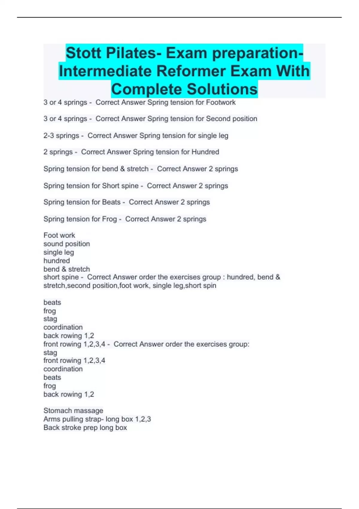 Stott Pilates- Exam preparation- Intermediate Reformer Exam With Complete Solutions 3 or 4 springs - Correct Answer Spring tension for Footwork 3 or 4 springs - Correct Answer Spring tension for Second position 2-3 springs - Correct Answer Spring tension for single leg 2 springs - Correct Answer Spring tension for Hundred Spring tension for bend & stretch - Correct Answer 2 springs Spring tension for Short spine - Correct Answer 2 springs Spring tension for Beats - Correct Answer 2 springs Spring tension for Frog - Correct Answer 2 springs Foot work sound position single leg hundred bend & stretch short spine - Correct Answer order the exercises group : hundred, bend & stretch,second position,foot work, single leg,short spin beats frog stag coordination back rowing 1,2 front rowing 1,2,3,4 - Correct Answer order the exercises group: stag front rowing 1,2,3,4 coordination beats frog back rowing 1,2 Stomach massage