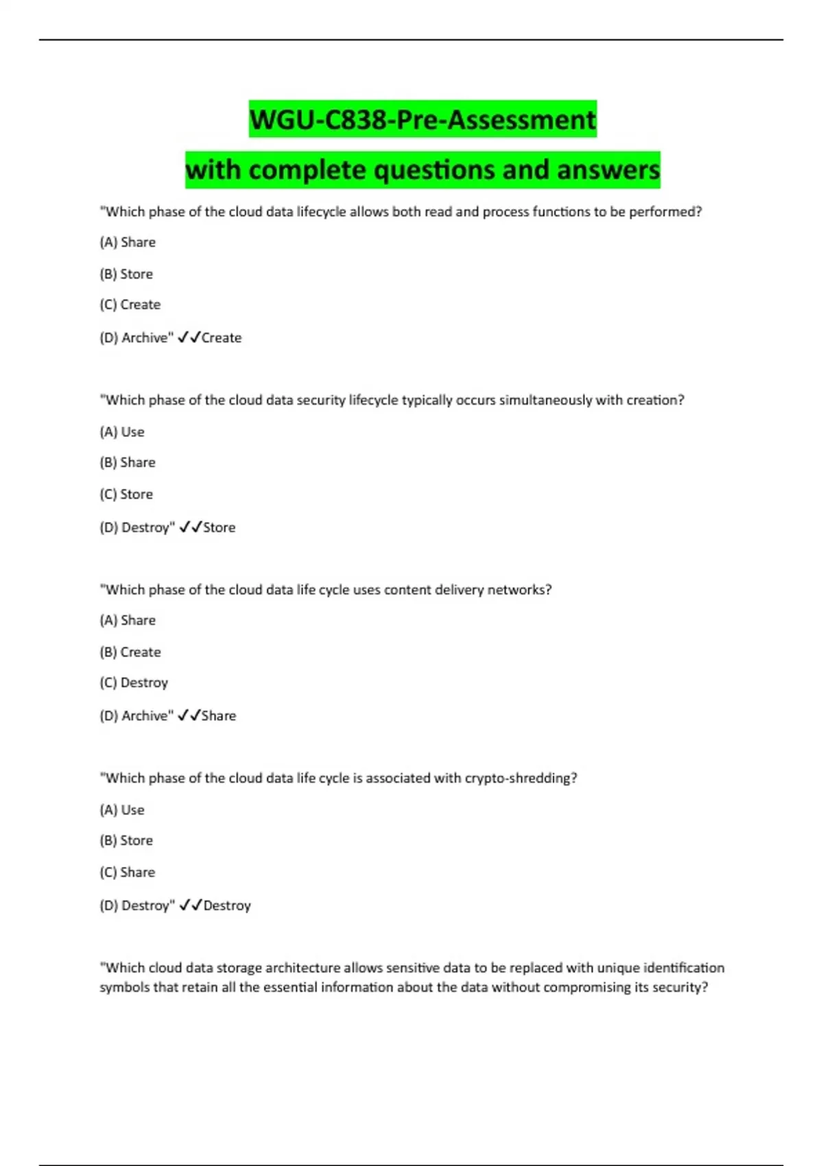 Which phase of the cloud data lifecycle allows both read and process functions to be performed? (A) Share (B) Store (C) Create (D) Archive" Create "Which phase of the cloud data security lifecycle typically occurs simultaneously with creation? (A) Use (B) Share (C) Store (D) Destroy" Store "Which phase of the cloud data life cycle uses content delivery networks? (A) Share (B) Create (C) Destroy (D) Archive" Share "Which phase of the cloud data life cycle is associated with crypto-shredding? (A) Use (B) Store (C) Share (D) Destroy" Destroy "Which cloud data storage architecture allows sensitive data to be replaced with unique identification symbols that retain all the essential information about the data without compromising its security?