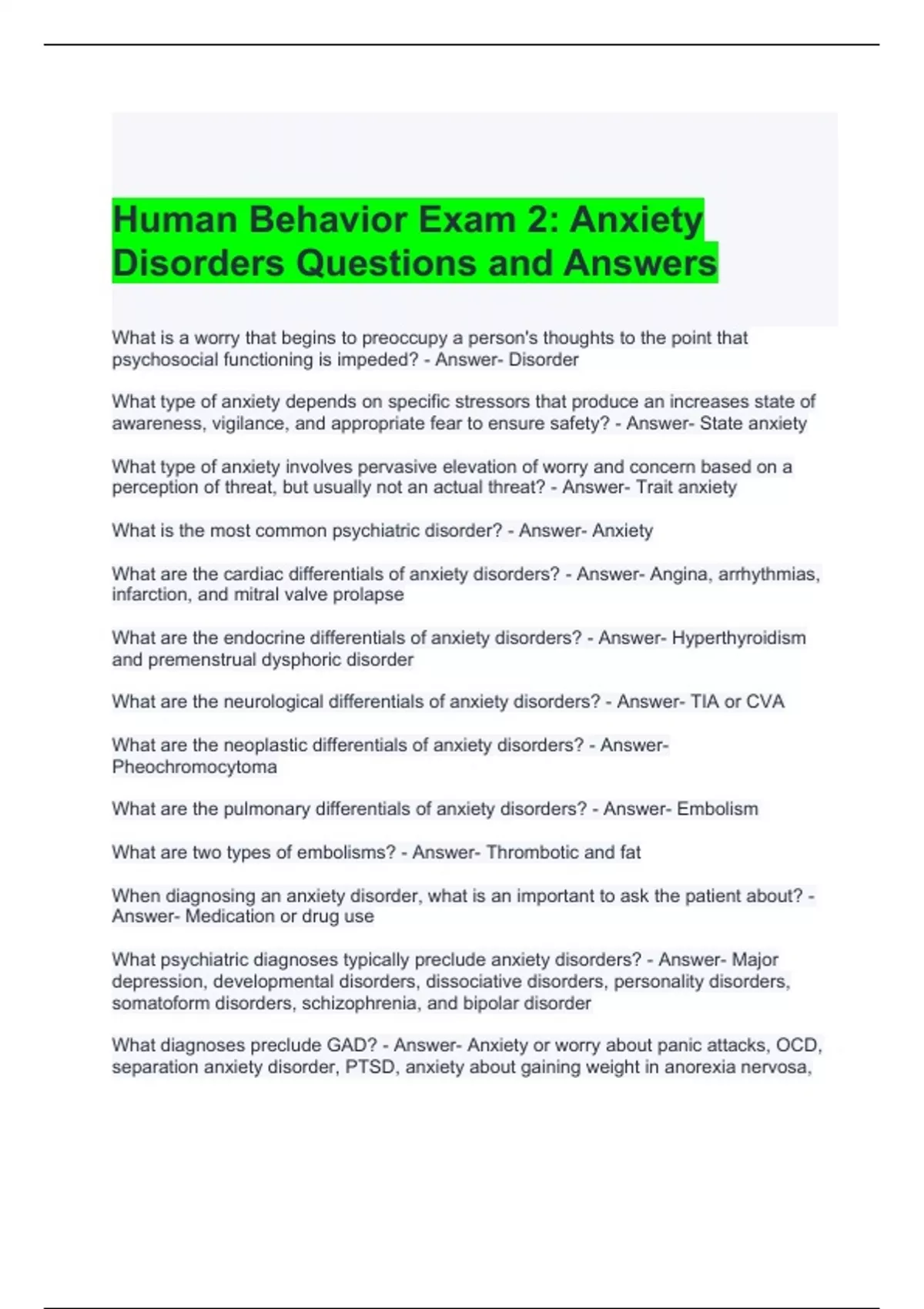 Human Behavior Exam 2 Anxiety Disorders Questions and Answers