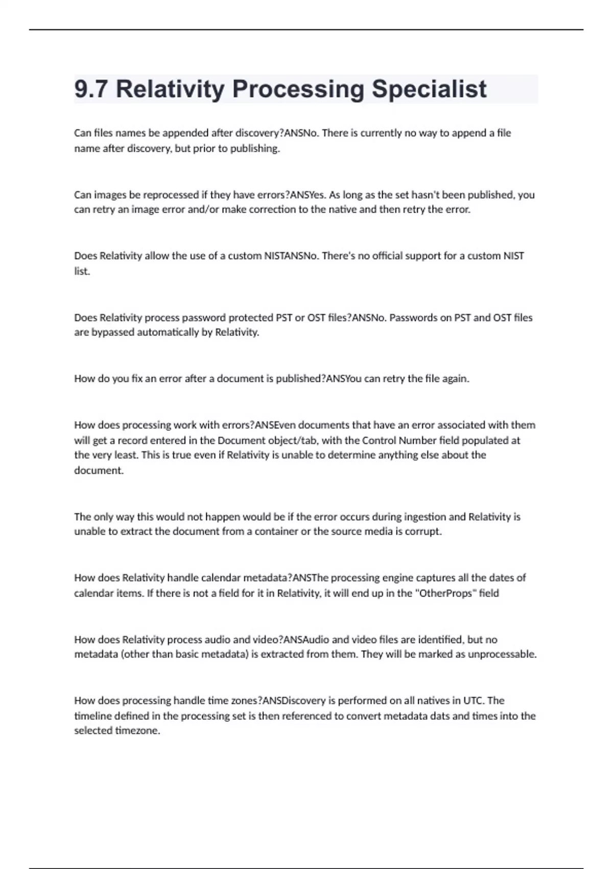 9.7 Relativity Processing Specialist Exam Questions With Correct Answers