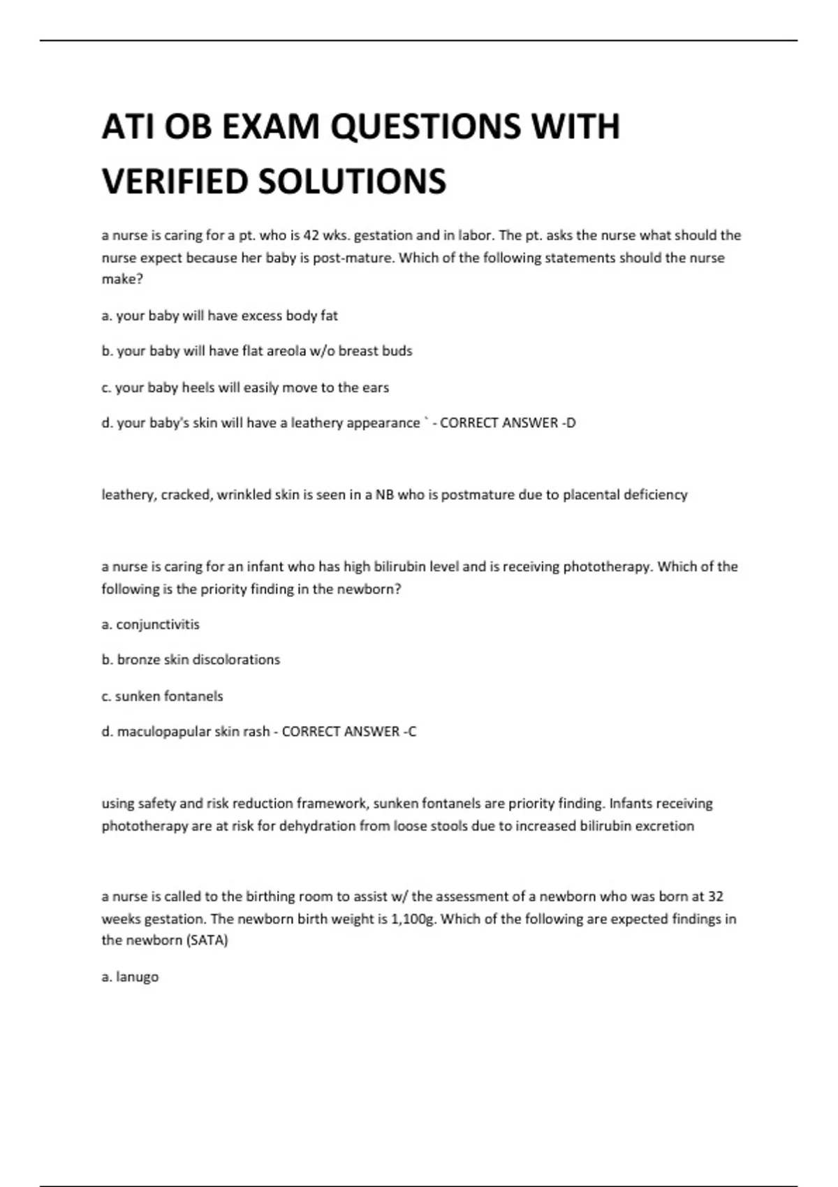 ATI OB EXAM QUESTIONS WITH VERIFIED SOLUTIONS a nurse is caring for a pt. who is 42 wks. gestation and in labor. The pt. asks the nurse what should the nurse expect because her baby is post-mature. Which of the following statements should the nurse make? a. your baby will have excess body fat b. your baby will have flat areola w/o breast buds c. your baby heels will easily move to the ears d. your baby's skin will have a leathery appearance ` - CORRECT ANSWER -D leathery, cracked, wrinkled skin is seen in a NB who is postmature due to placental deficiency a nurse is caring for an infant who has high bilirubin level and is receiving phototherapy. Which of the following is the priority finding in the newborn? a. conjunctivitis b. bronze skin discolorations c. sunken fontanels d. maculopapular skin rash - CORRECT ANSWER -C using safety and risk reduction framework, sunken fontanels are priority finding. Infants receiving phototherapy are at risk for dehydration from loose stools due to increased bilirubin excretion a nurse is called to the birthing room to assist w/ the assessment of a newborn who was born at 32 weeks gestation. The newborn birth weight is 1,100g. Which of the following are expected findings in the newborn (SATA) a. lanugo b. long nails c. weak grasp reflex d. translucent skin e. plump face - CORRECT ANSWER -A, C, D a. characteristics of a preterm NB include the presence of abundant lanugo c. a weak grasp reflex is characteristic of a preterm NB d. skin that is thin, smooth, shiny, and translucent is a finding in a preterm NB a nurse is caring for a newborn who is preterm and has resp. distress syndrome. Which of the following should the nurse monitor to evaluate the newborn's condition following administration of synthetic surfactant? a. oxygen saturation b. body temp. c. serum bilirubin d. HR - CORRECT ANSWER -A surfactant stabilizes the alveoli and helps increase oxygen saturation a nurse is teaching a newly licensed nurse about neonatal abstinence syndrome. Which of the following statements by the nurse indicate understanding of the teaching? a. the newborn will have decreased muscle tone b. the newborn will have a continuous high-pitched cry c. the newborn will sleep for 2-3 hours after feeding d. the newborn will have mild tremors when disturbed - CORRECT ANSWER -B. a continuous highpitched cry is often an indication of CNS disturbance in . newborn who hs neonatal abstinence syndrome a nurse is reviewing care of the umbilical cord w/ the parent of a NB. Which of the following instructions should the nurse include in the teaching ?