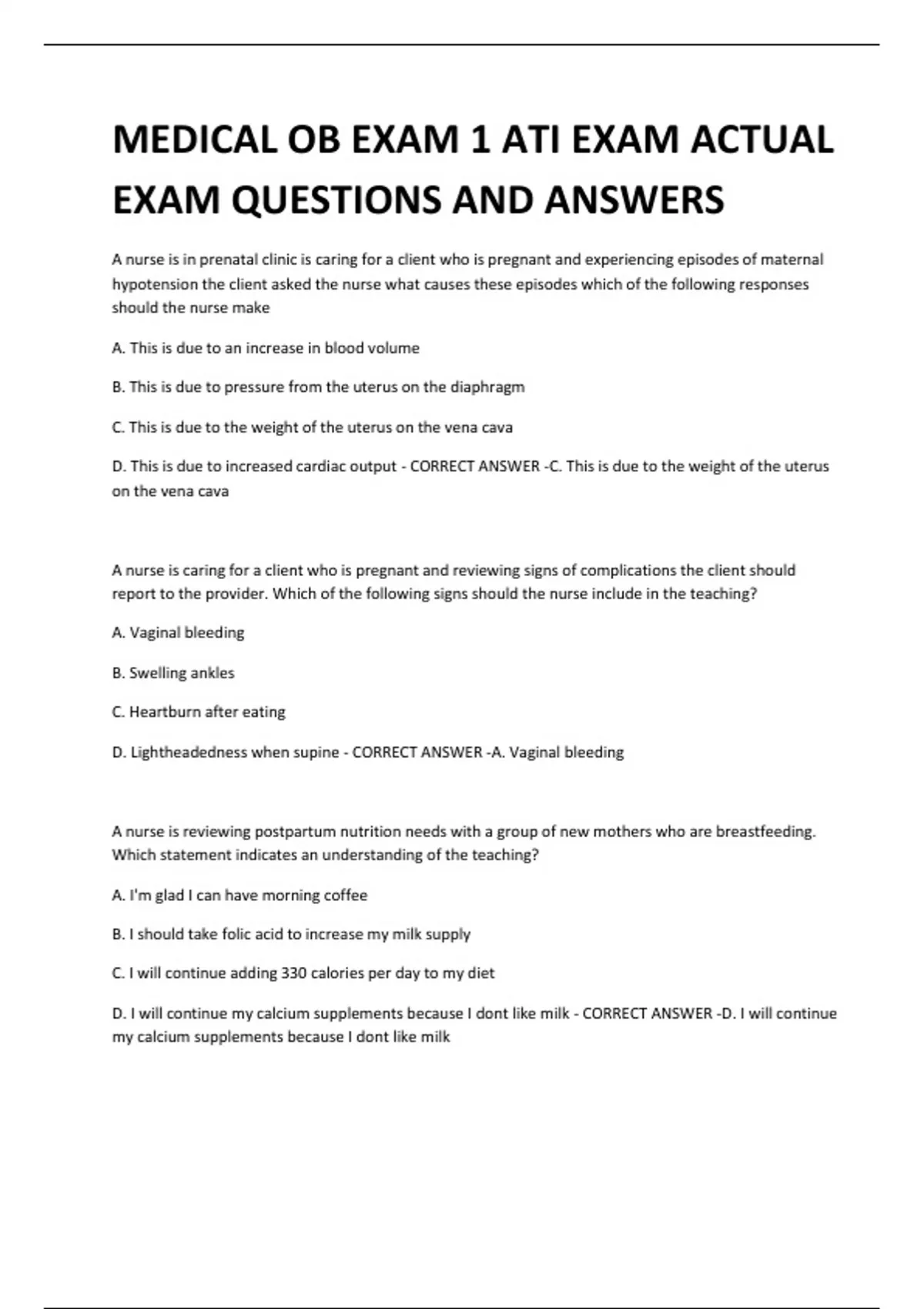 MEDICAL OB EXAM 1 ATI EXAM ACTUAL EXAM QUESTIONS AND ANSWERS A nurse is in prenatal clinic is caring for a client who is pregnant and experiencing episodes of maternal hypotension the client asked the nurse what causes these episodes which of the following responses should the nurse make A. This is due to an increase in blood volume B. This is due to pressure from the uterus on the diaphragm C. This is due to the weight of the uterus on the vena cava D. This is due to increased cardiac output - CORRECT ANSWER -C. This is due to the weight of the uterus on the vena cava A nurse is caring for a client who is pregnant and reviewing signs of complications the client should report to the provider. Which of the following signs should the nurse include in the teaching? A. Vaginal bleeding B. Swelling ankles C. Heartburn after eating D. Lightheadedness when supine - CORRECT ANSWER -A. Vaginal bleeding A nurse is reviewing postpartum nutrition needs with a group of new mothers who are breastfeeding. Which statement indicates an understanding of the teaching? A. I'm glad I can have morning coffee B. I should take folic acid to increase my milk supply C. I will continue adding 330 calories per day to my diet D. I will continue my calcium supplements because I dont like milk - CORRECT ANSWER -D. I will continue my calcium supplements because I dont like milk