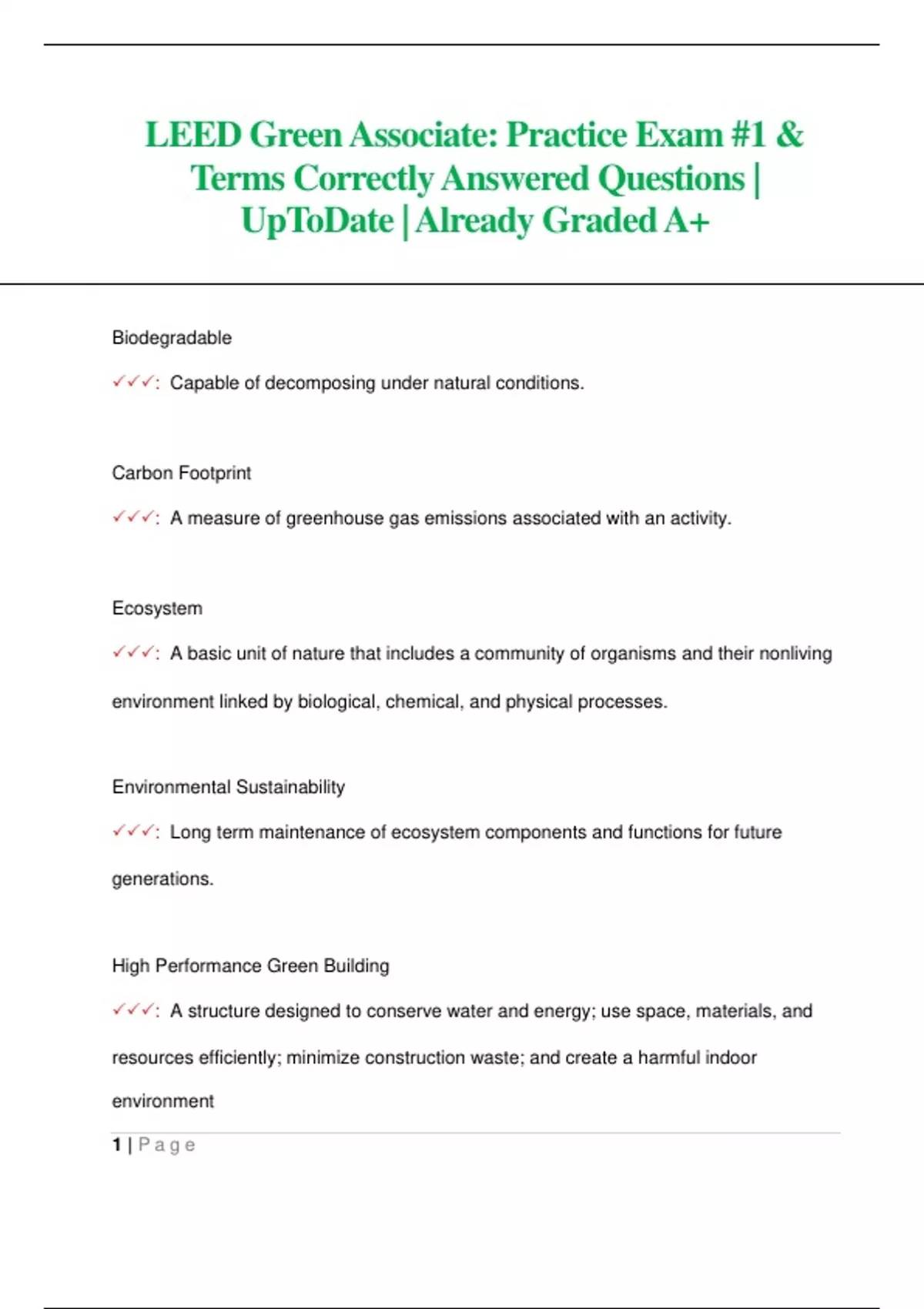 LEED Green Associate: Practice Exam #1 & Terms Correctly Answered Questions| UpToDate | Already Graded A+