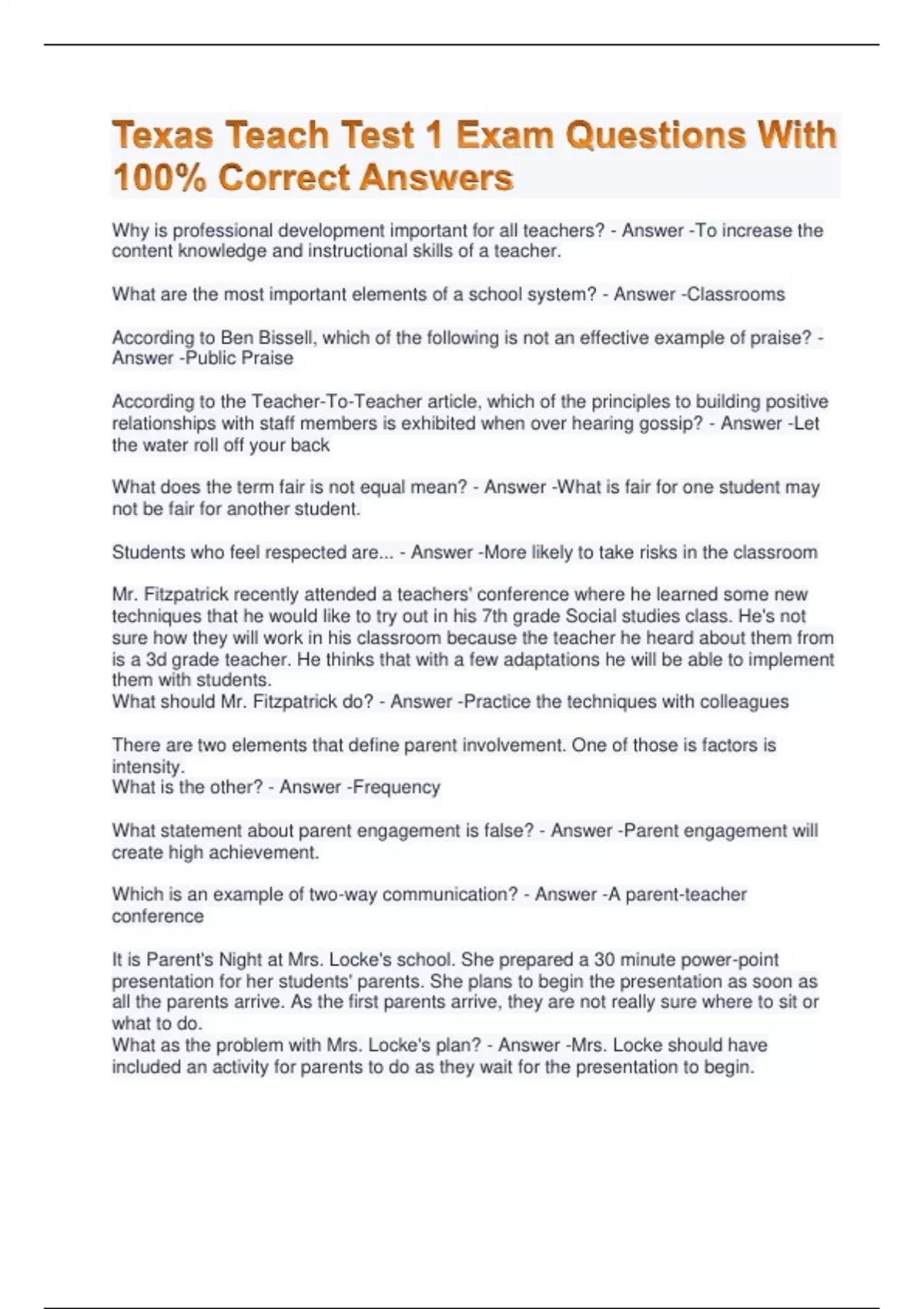 Texas Teach Test 1 Exam Questions With 100% Correct Answers Why is professional development important for all teachers? - Answer -To increase the content knowledge and instructional skills of a teacher. What are the most important elements of a school system? - Answer -Classrooms According to Ben Bissell, which of the following is not an effective example of praise? - Answer -Public Praise According to the Teacher-To-Teacher article, which of the principles to building positive relationships with staff members is exhibited when over hearing gossip? - Answer -Let the water roll off your back What does the term fair is not equal mean? - Answer -What is fair for one student may not be fair for another student. Students who feel respected are... - Answer -More likely to take risks in the classroom Mr. Fitzpatrick recently attended a teachers' conference where he learned some new techniques that he would like to try out in his 7th grade Social studies class. He's not sure how they will work in his classroom because the teacher he heard about them from is a 3d grade teacher. He thinks that with a few adaptations he will be able to implement them with students. What should Mr. Fitzpatrick do? - Answer -Practice the techniques with colleagues There are two elements that define parent involvement. One of those is factors is intensity. What is the other? - Answer -Frequency