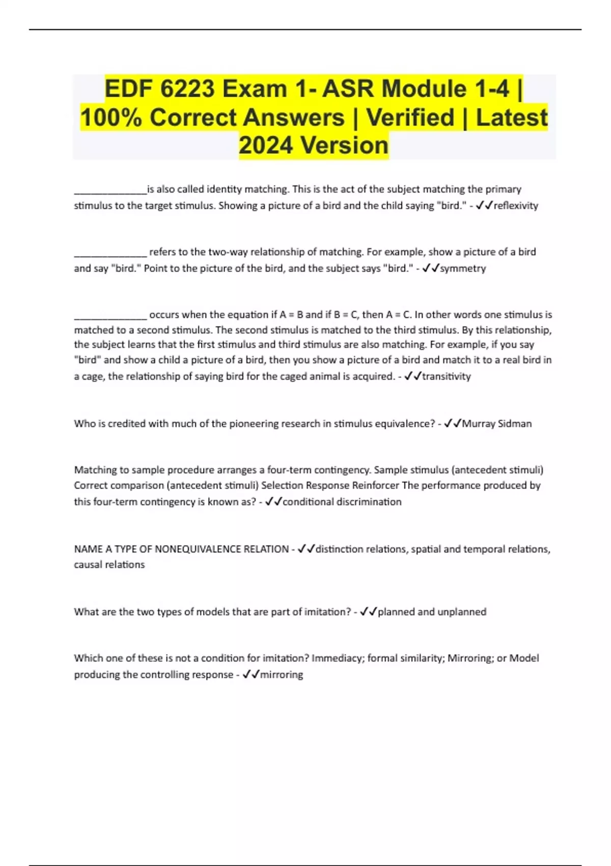 _____________is also called identity matching. This is the act of the subject matching the primary stimulus to the target stimulus. Showing a picture of a bird and the child saying "bird." - reflexivity _____________ refers to the two-way relationship of matching. For example, show a picture of a bird and say "bird." Point to the picture of the bird, and the subject says "bird." - symmetry _____________ occurs when the equation if A = B and if B = C, then A = C. In other words one stimulus is matched to a second stimulus. The second stimulus is matched to the third stimulus. By this relationship, the subject learns that the first stimulus and third stimulus are also matching. For example, if you say "bird" and show a child a picture of a bird, then you show a picture of a bird and match it to a real bird in a cage, the relationship of saying bird for the caged animal is acquired. - transitivity Who is credited with much of the pioneering research in stimulus equivalence? - Murray Sidman Matching to sample procedure arranges a four-term contingency. Sample stimulus (antecedent stimuli) Correct comparison (antecedent stimuli) Selection Response Reinforcer The performance produced by this four-term contingency is known as? - conditional discrimination NAME A TYPE OF NONEQUIVALENCE RELATION - distinction relations, spatial and temporal relations, causal relations What are the two types of models that are part of imitation? - planned and unplanned Which one of these is not a condition for imitation? Immediacy; formal similarity; Mirroring; or Model producing the controlling response - mirroringWith an understanding of the imitation process, applied behavior analysts can use imitation as an intervention to: a.) Eliminate Old Behaviors b.) Evoke New behaviors c.) Create teaching sequences d.) Reinforce appropriate behaviors - b.) Evoke New behaviors The controlling variable for an imitative behavior is: a.) An operative behavior b.)An imitative response chain c.) A model d.) A pre-task - c.) A model Learning to purchase a soda from a vending machine by first watching someone else purchase a soda would be an example of: a.) Planned echoic stimuli b.) Unplanned echoic stimuli c.) Planned models d.) Unplanned models - d.) Unplanned models When a child picks up a fork immediately after observing her father pick up a fork, this imitative behavior has: a.) Planned similarity b.) Unplanned similarity c.) Formal similarity d.) Informal similarity - c.) Formal similarity