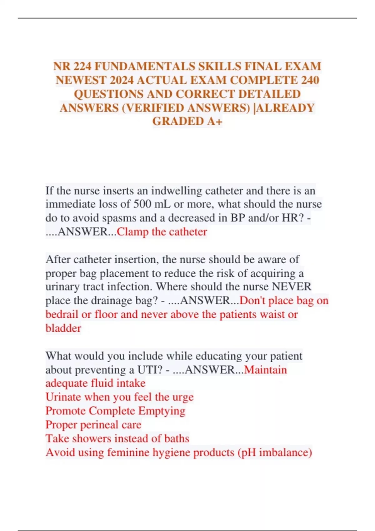 NR 224 FUNDAMENTALS SKILLS FINAL EXAM NEWEST 2024 ACTUAL EXAM COMPLETE 240 QUESTIONS AND CORRECT DETAILED ANSWERS (VERIFIED ANSWERS) |ALREADY GRADED A+