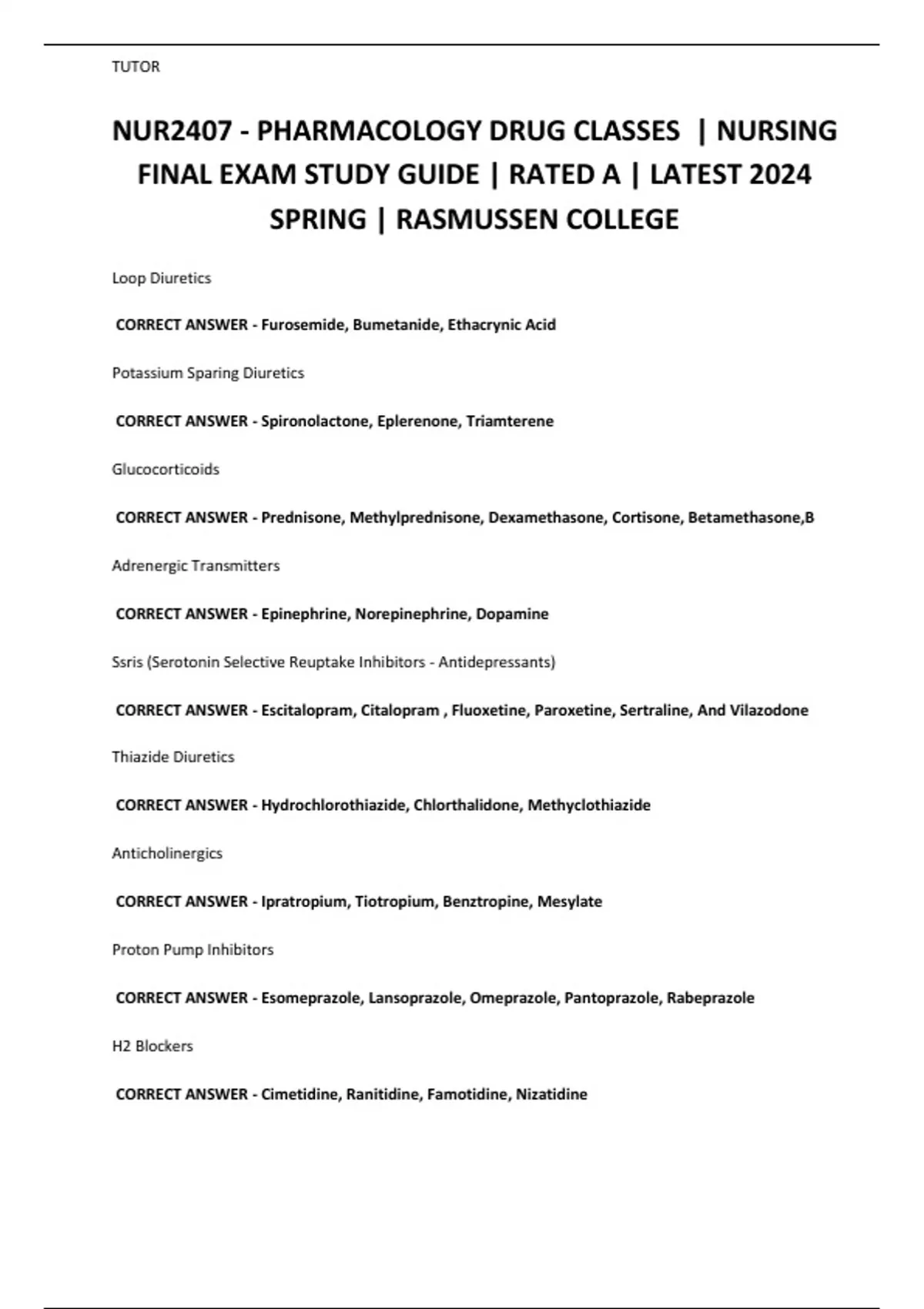 NUR2407 - PHARMACOLOGY DRUG CLASSES | NURSING FINAL EXAM STUDY GUIDE | RATED A | LATEST 2024 SPRING | RASMUSSEN COLLEGE