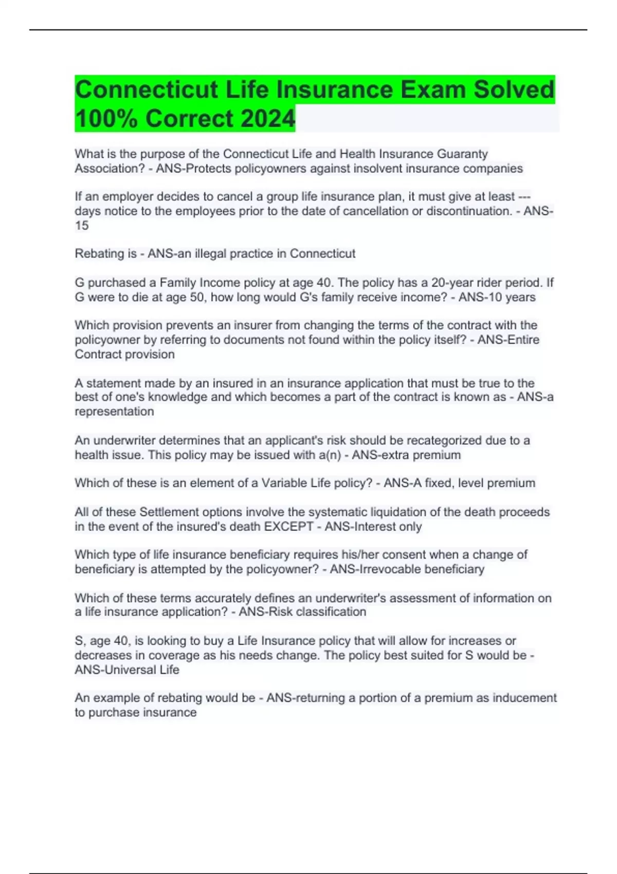 Connecticut Life Insurance Exam Solved 100% Correct 2024