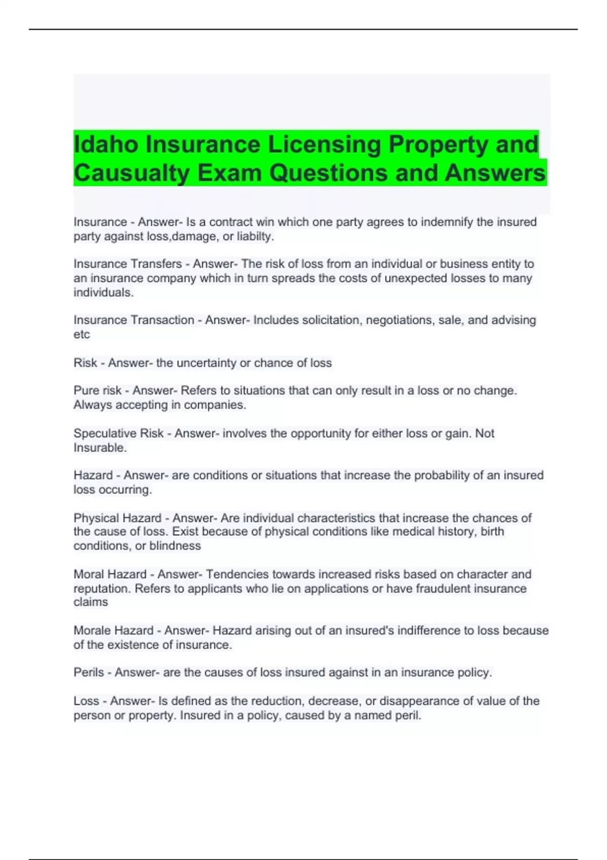 Idaho Insurance Licensing Property and Causualty Exam Questions and Answers 2024